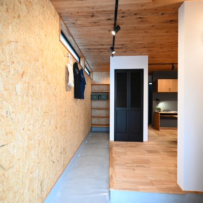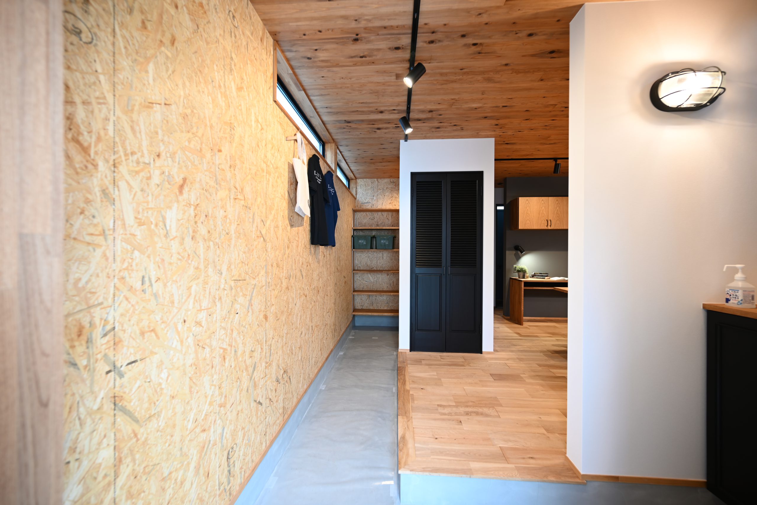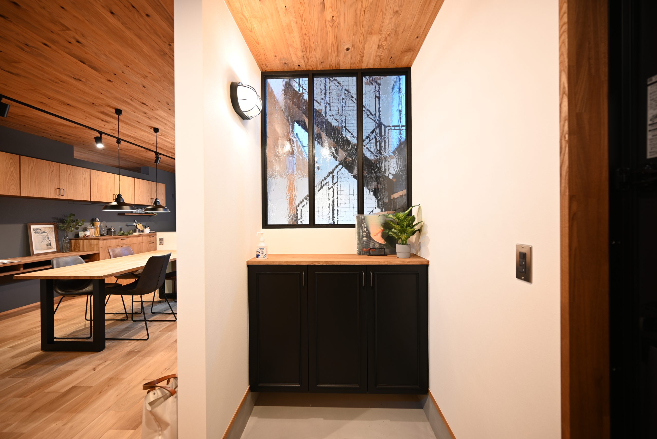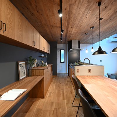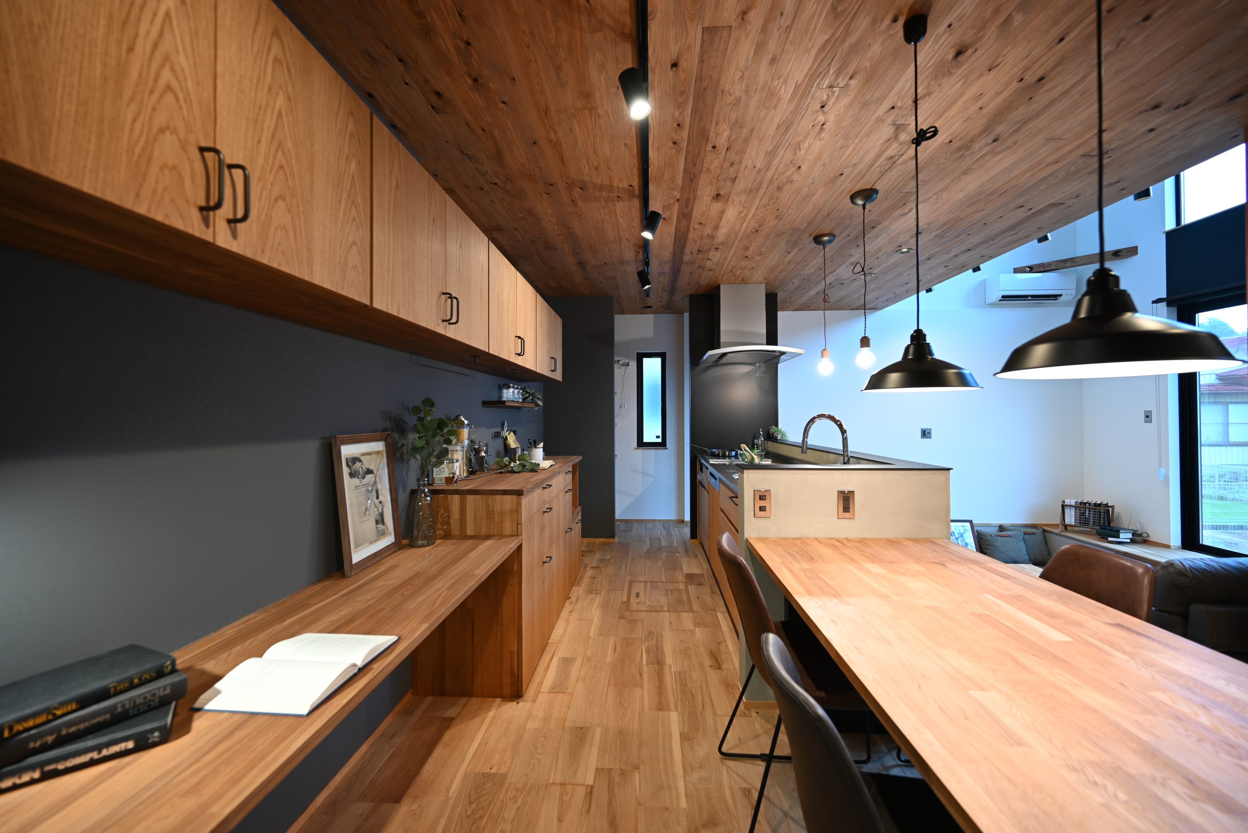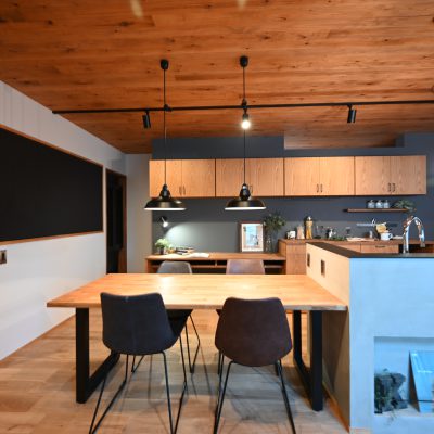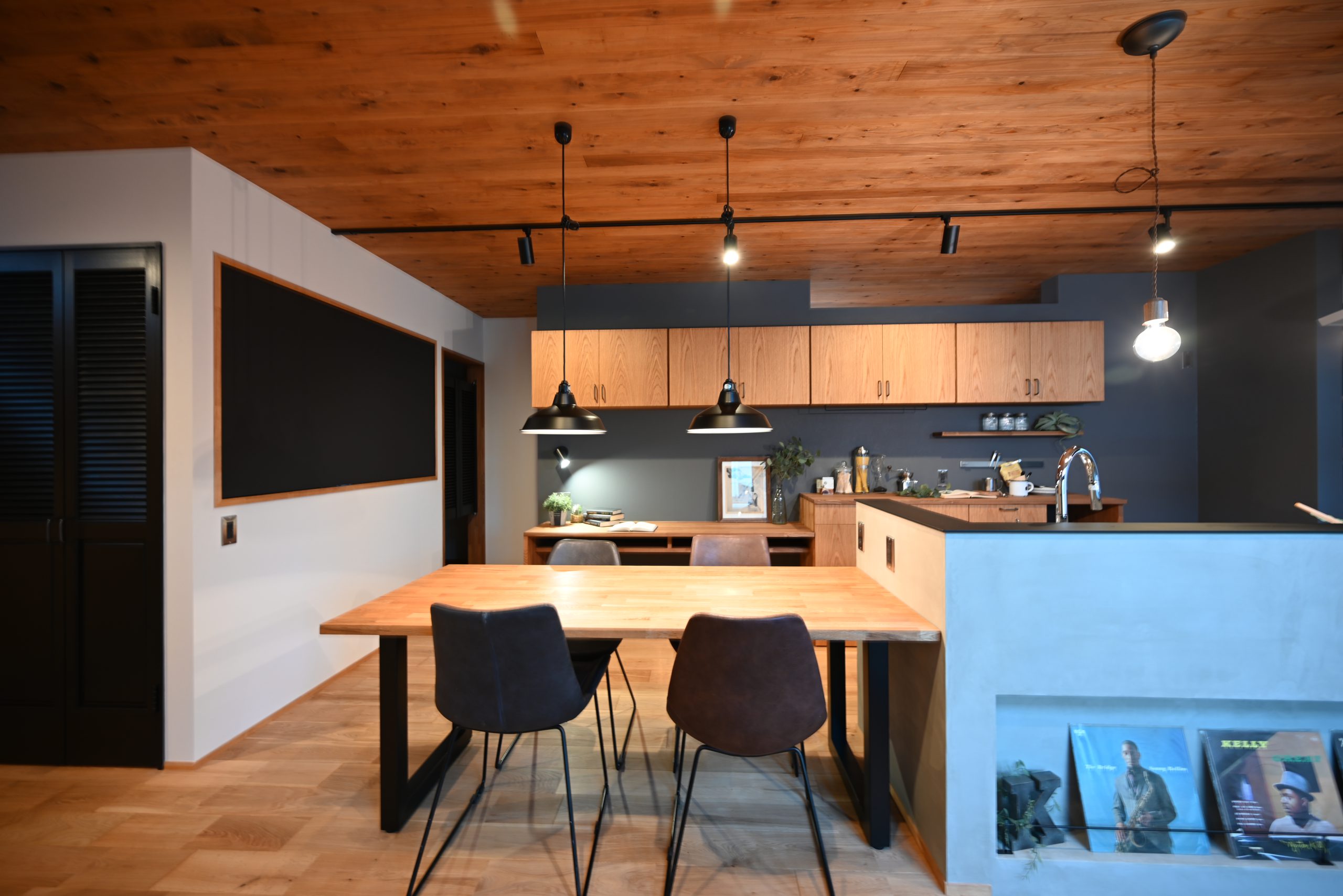 - 天井板張りとモルタルキッチンの組み合わせがかっこいいダイニングキッチン