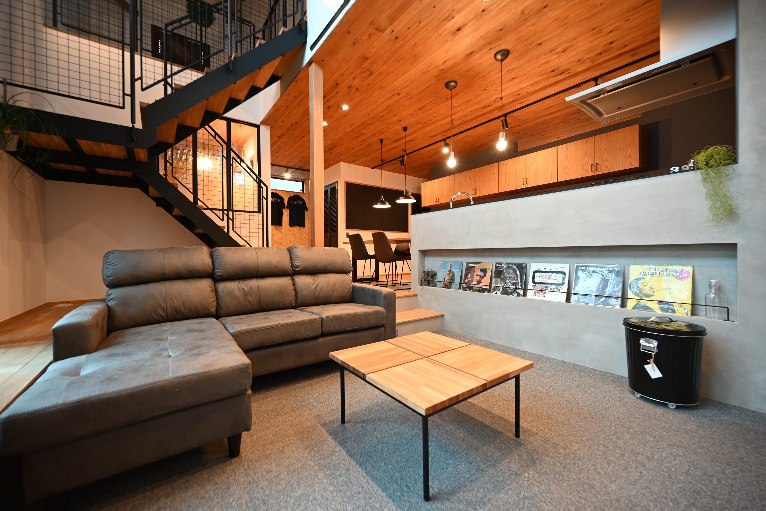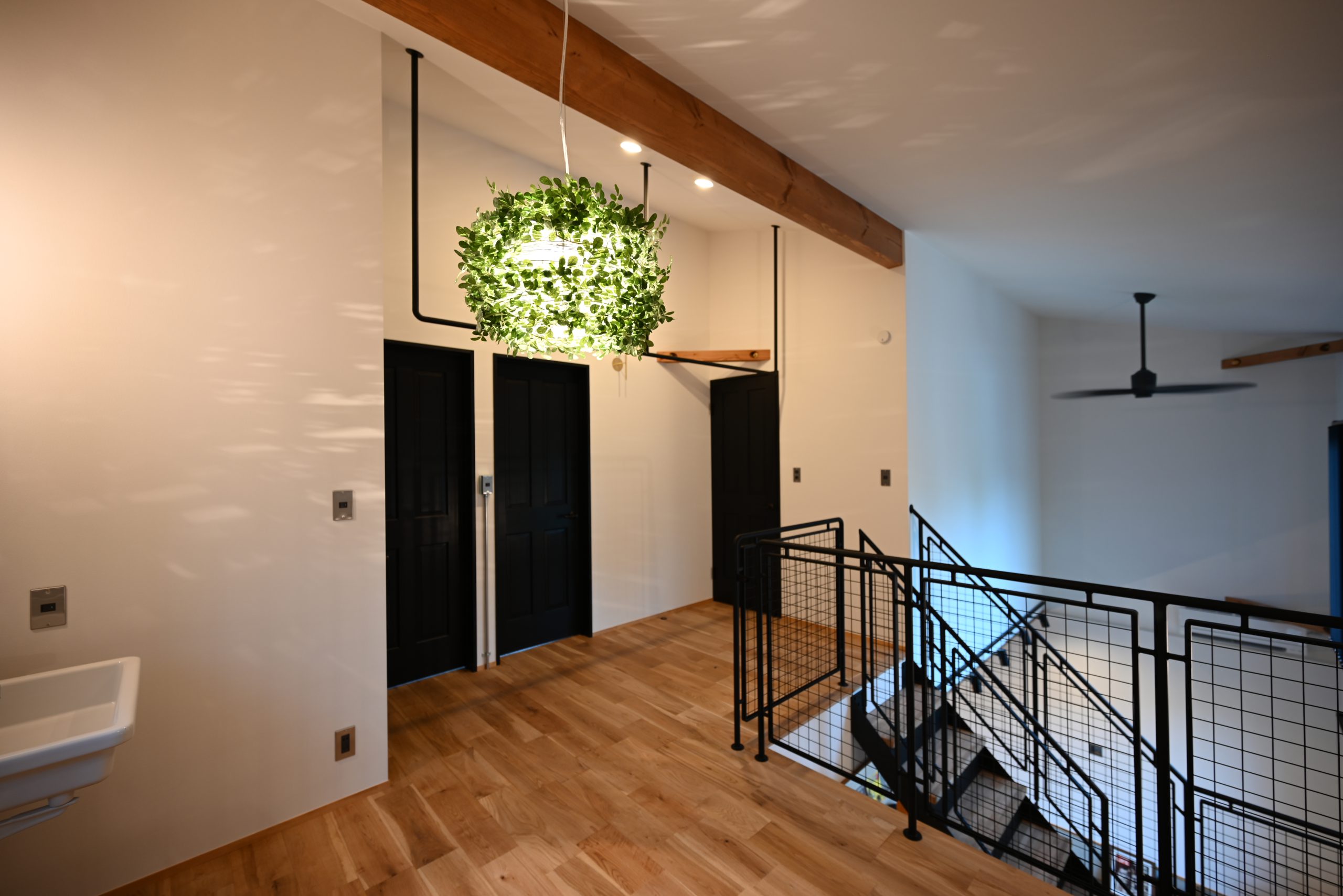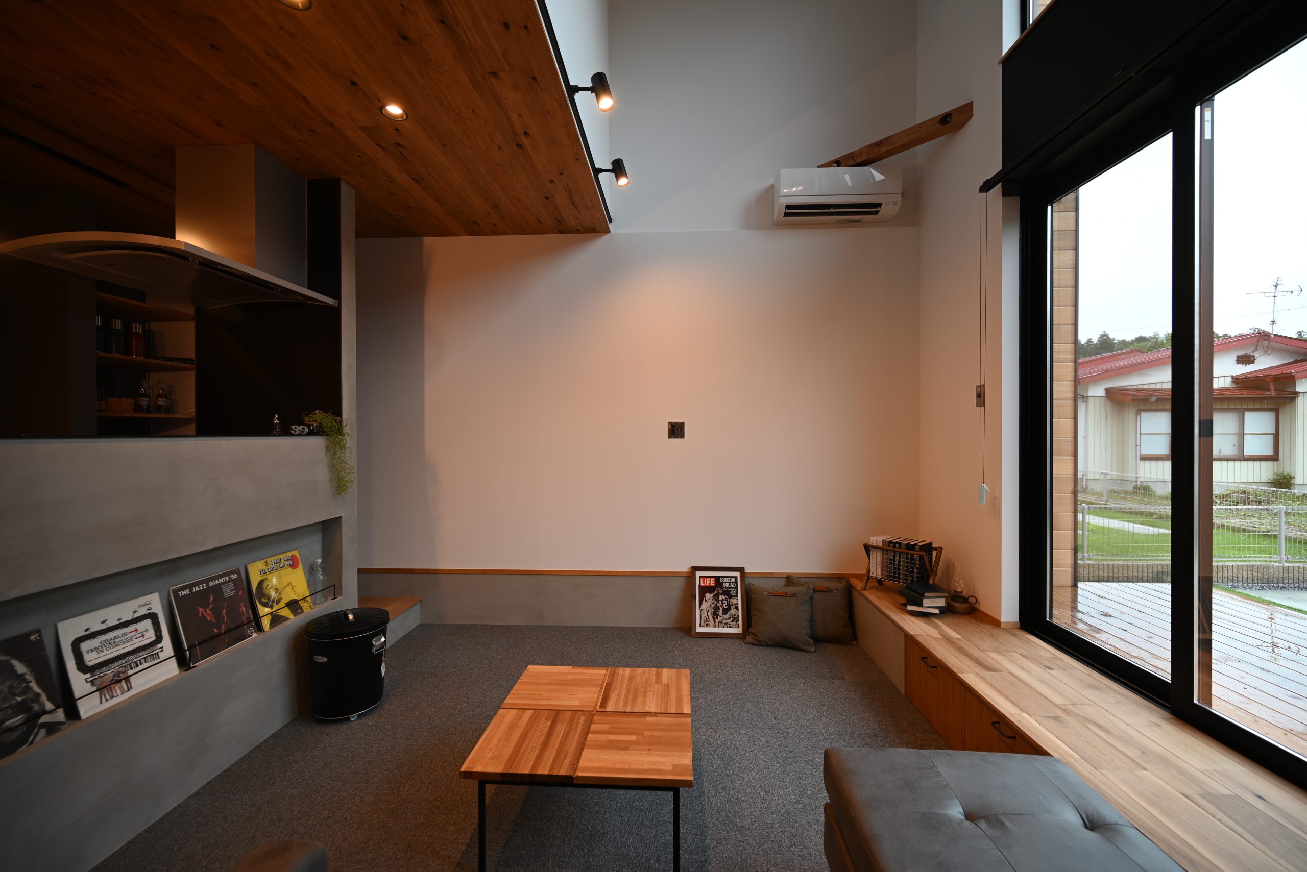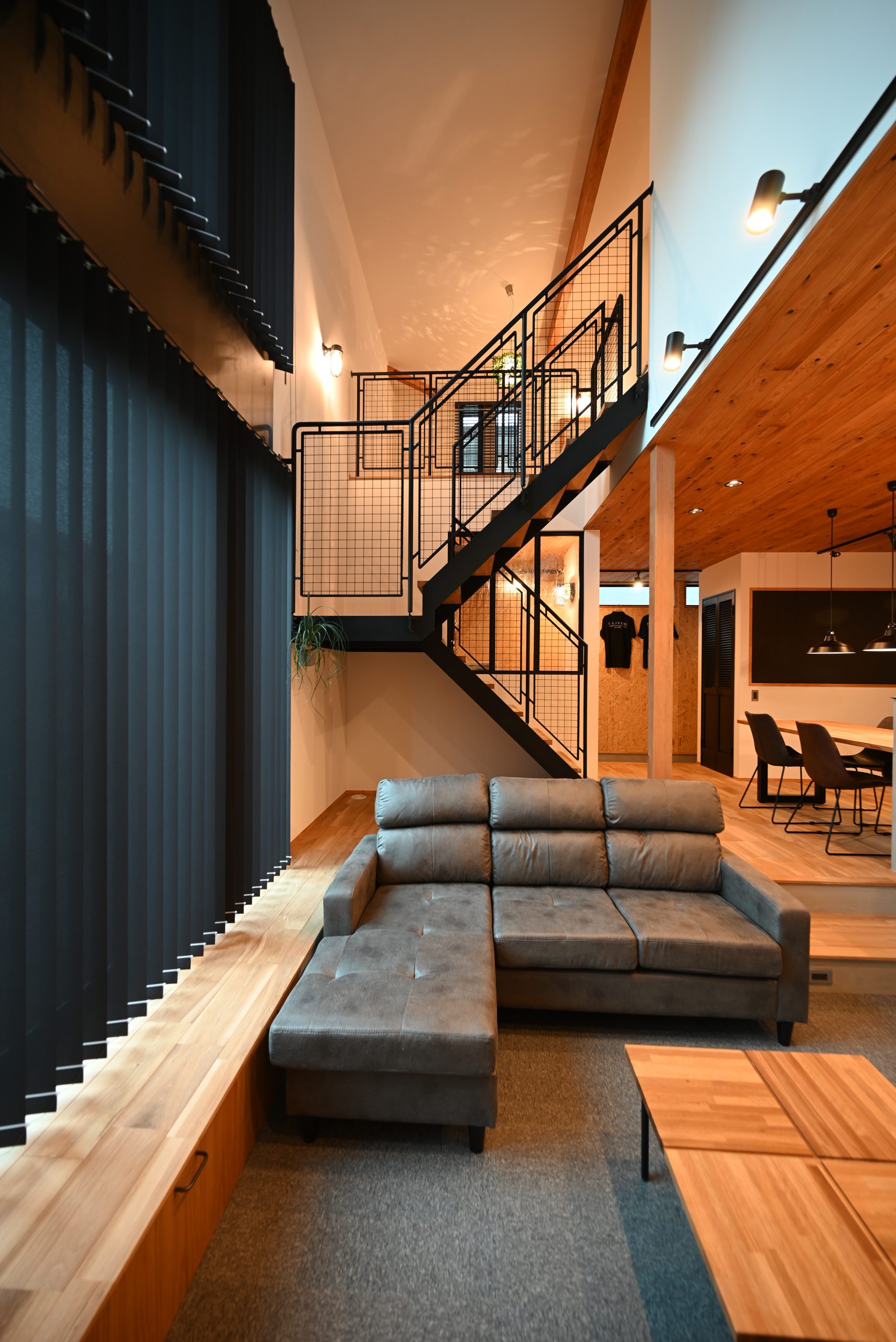 ダウンフロアのリビングで空間に余裕を持たせて、モルタルのキッチンや造作のアイアンなどで、カッコよさを追求しました