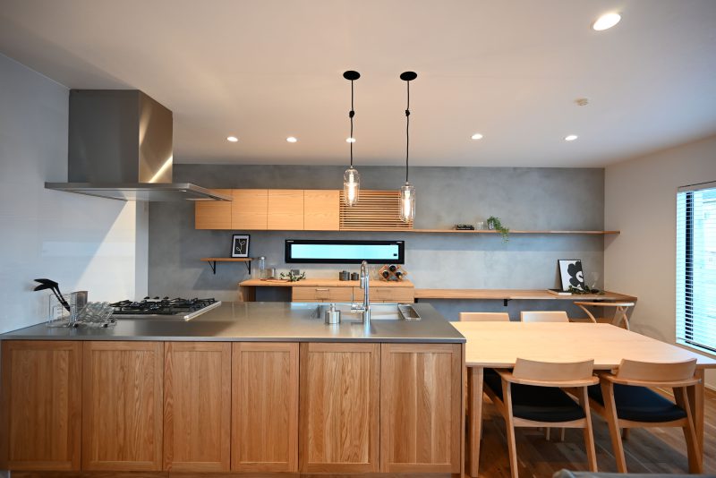 モルタル壁とキッチンの板張りが、洗練された雰囲気を出していてとてもカッコいいです♪