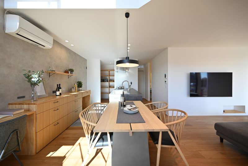 テレビを壁掛けにしたり、埋め込み収納を採用することで、リビングがとてもすっきりした印象になっています。