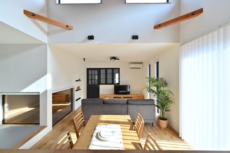 勾配天井を使って高い場所からの光を取り入れ、とても広く感じられるLDKです。