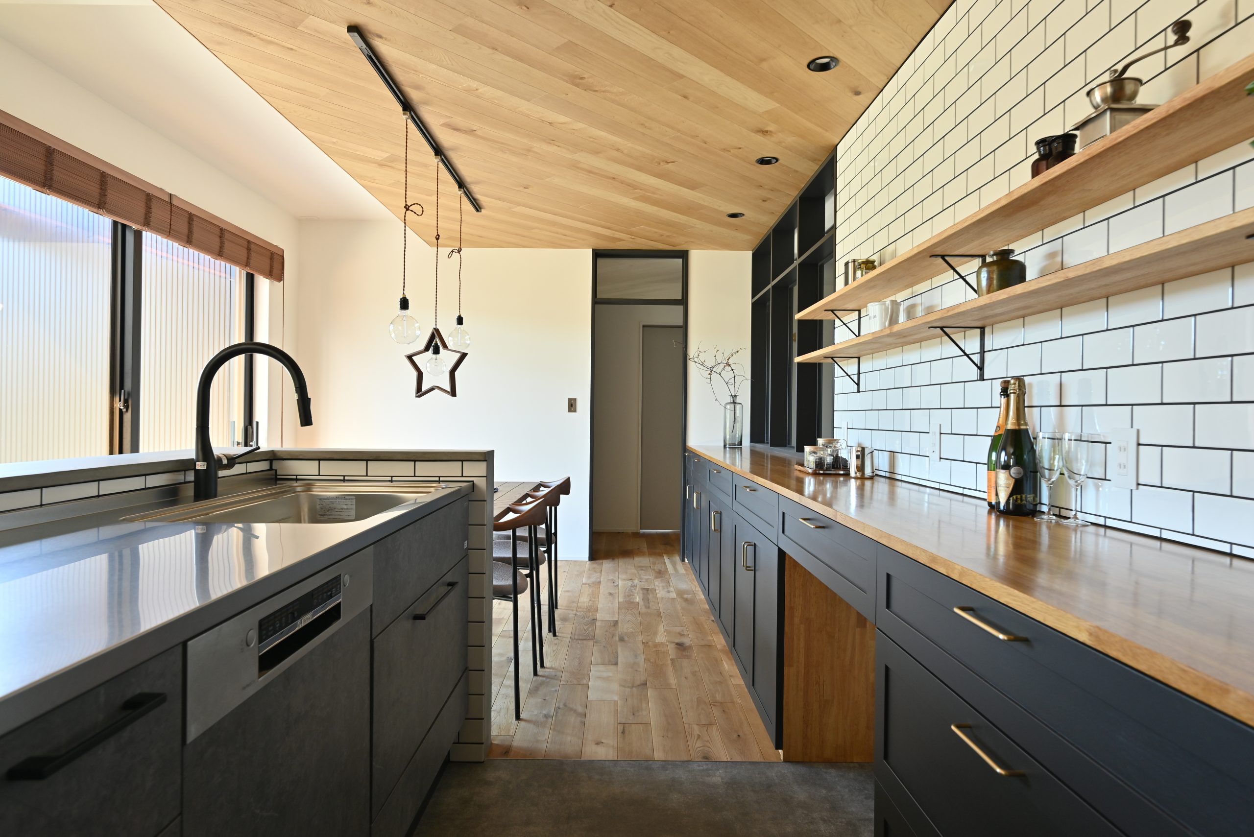 サブウェイタイルと紺色の造作収納棚、モルタルキッチンが雰囲気を底上げしていくれています。
