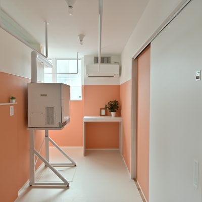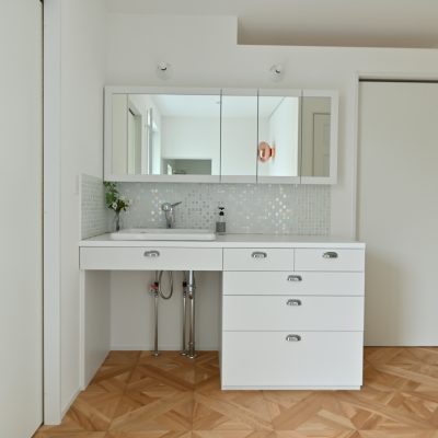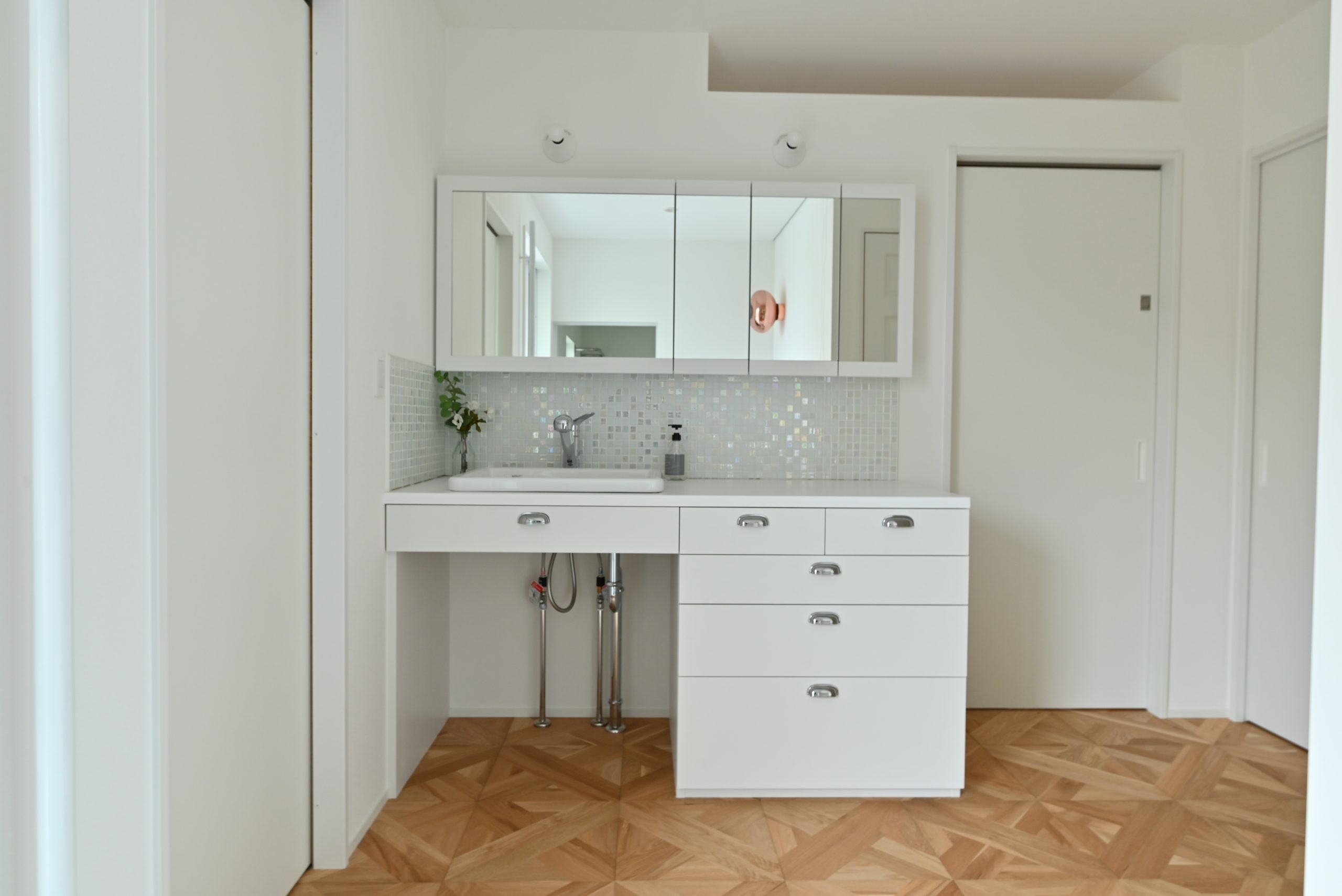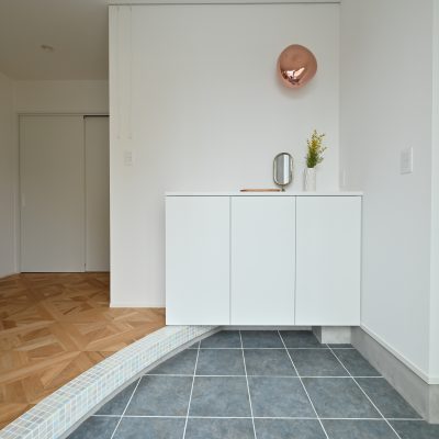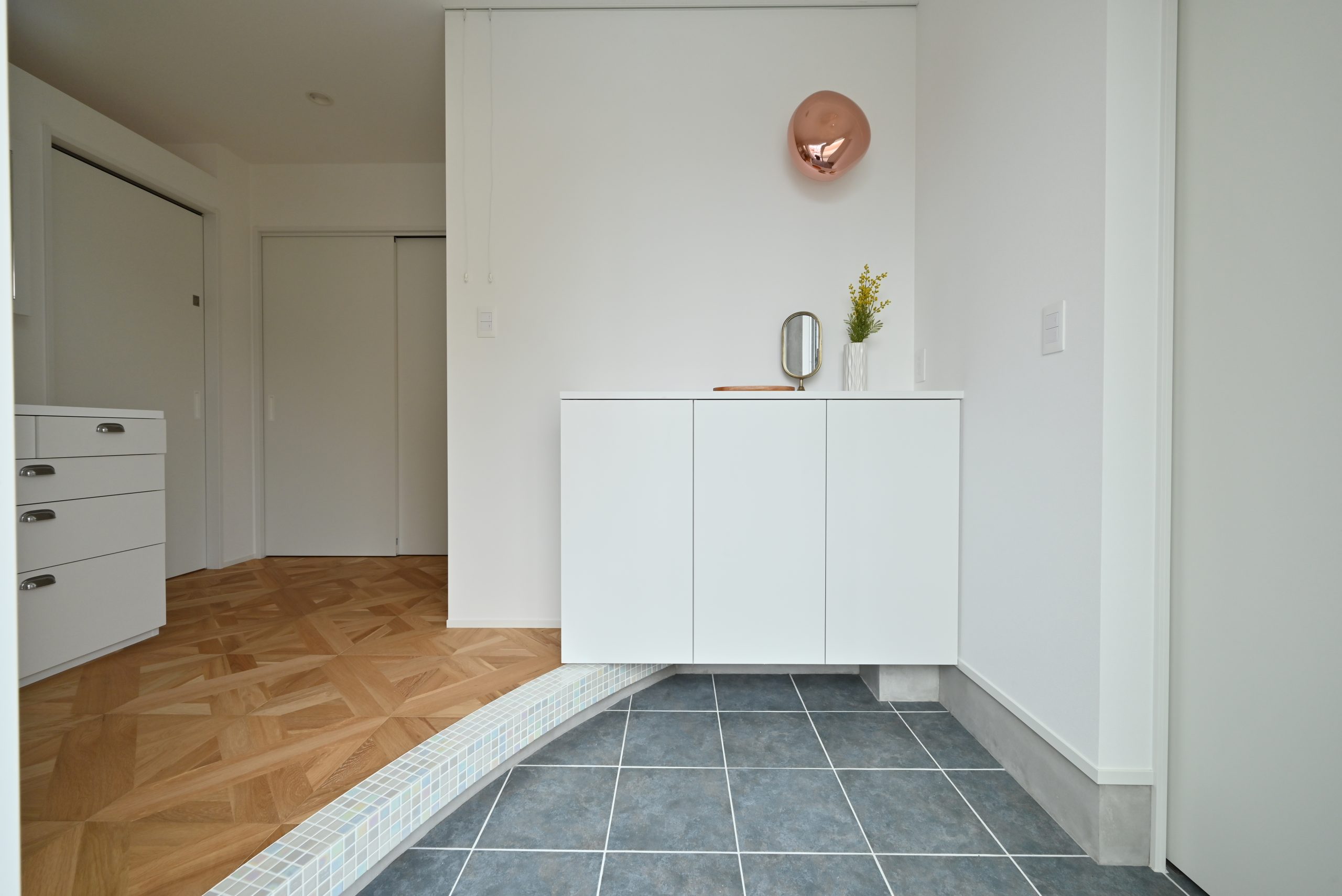 玄関框のタイルと洗面台の可愛らしい小さめタイルは