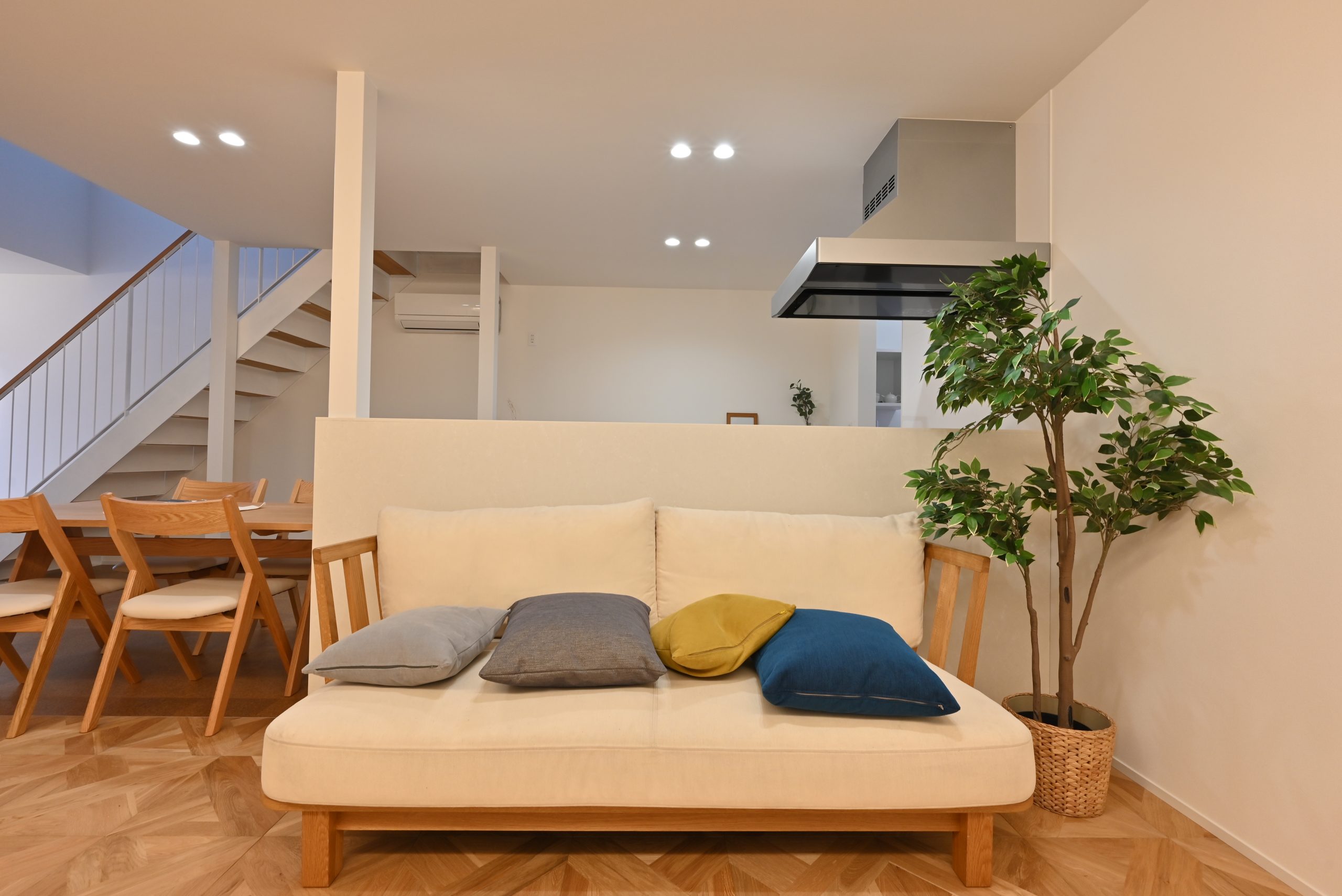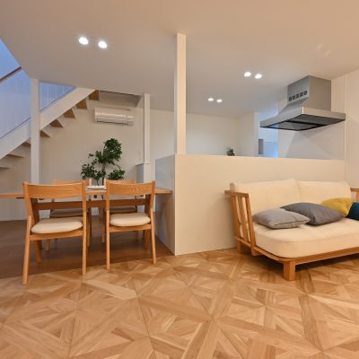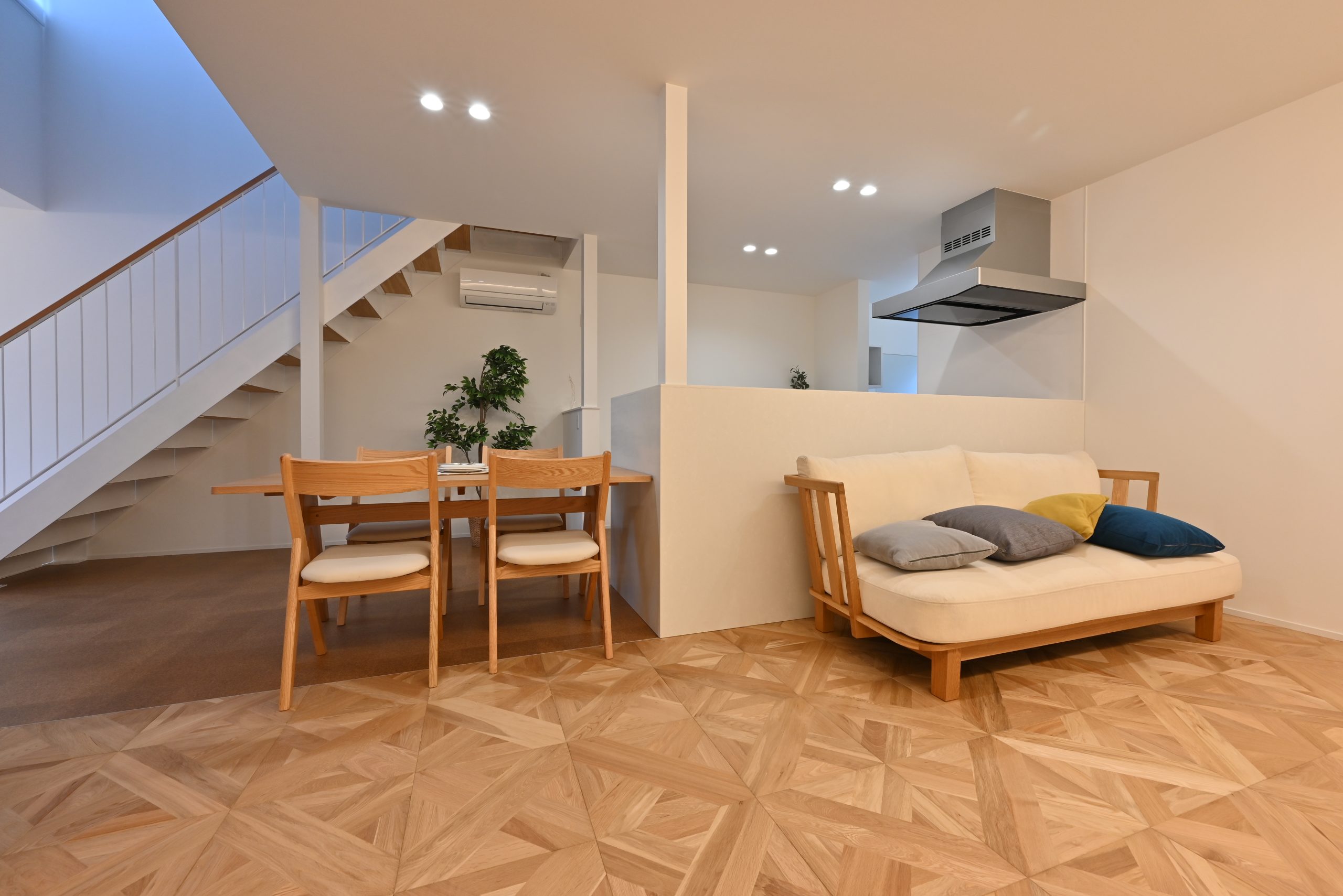 パーケットフロアの床がおしゃれな印象を格上げしてくれます。