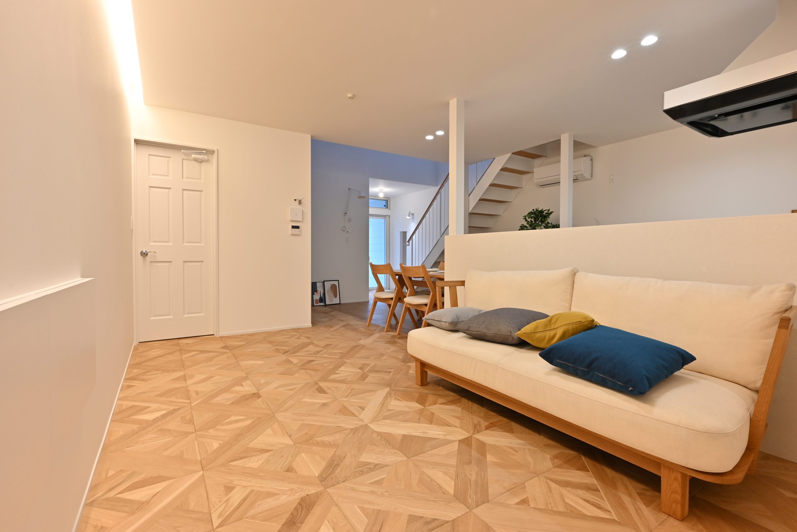 パーケットフロアの床がおしゃれな印象を格上げしてくれます。