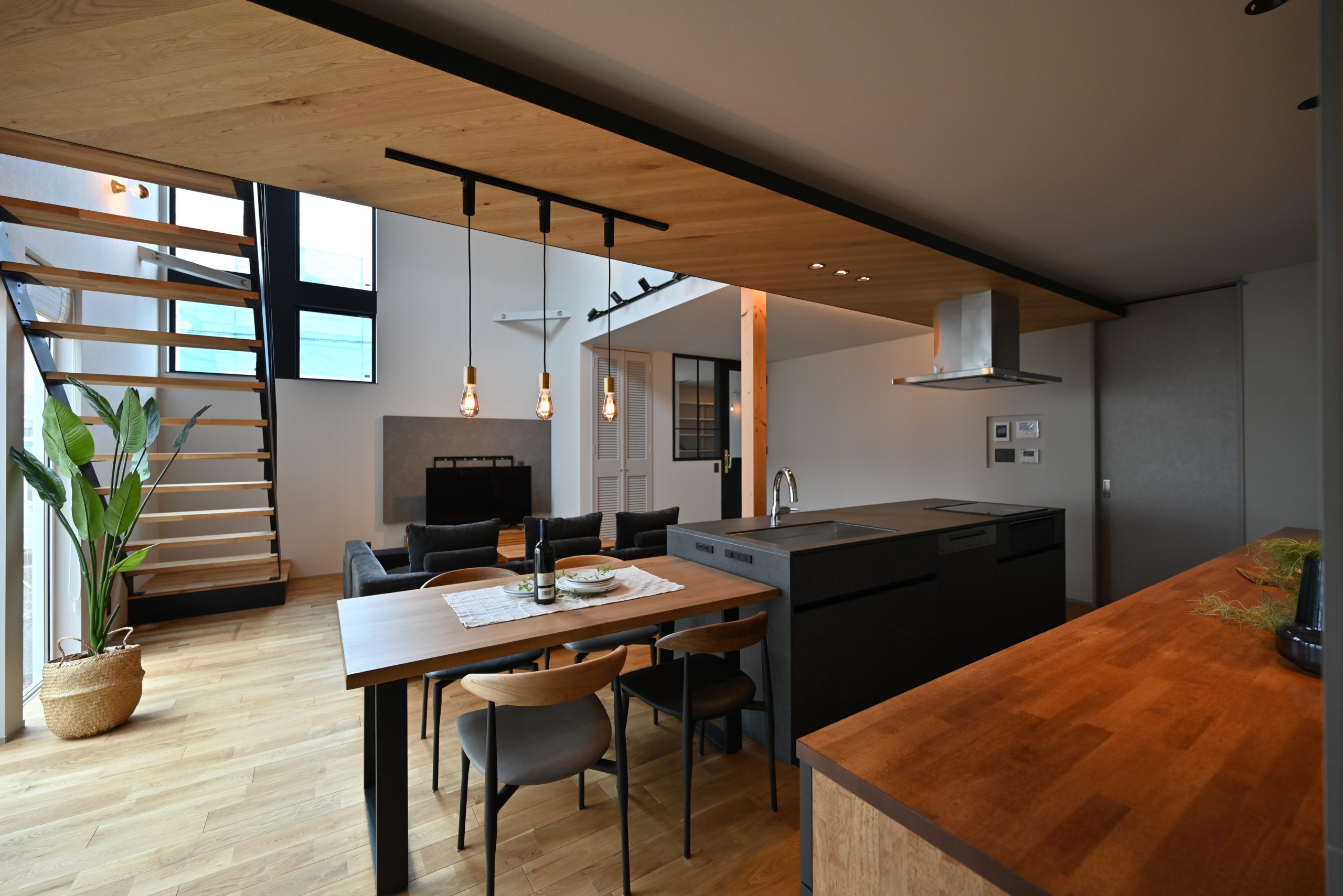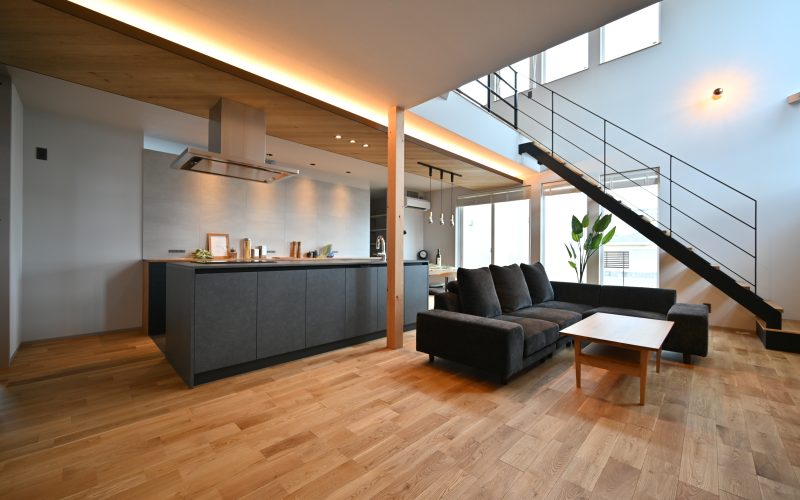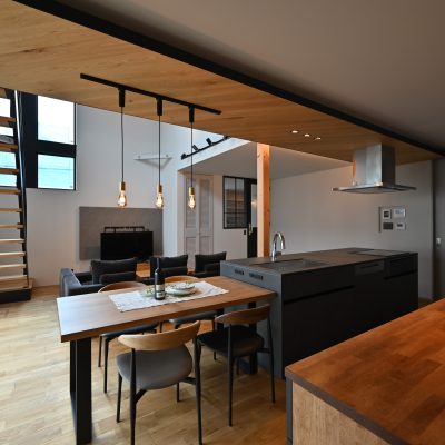 黒を効かせたフレームやキッチンのシャープな質感が、空間を引き締めながらも、全体としてどこかやわらかい印象を与えてくれる住まいです。