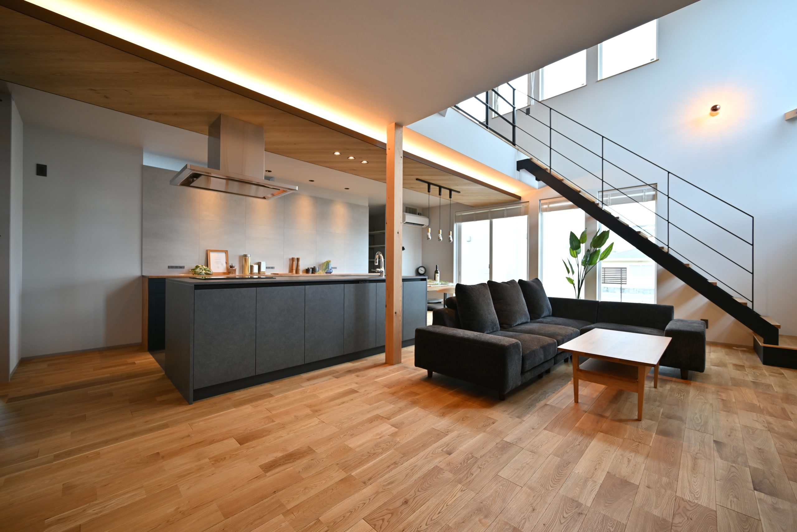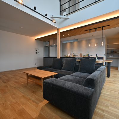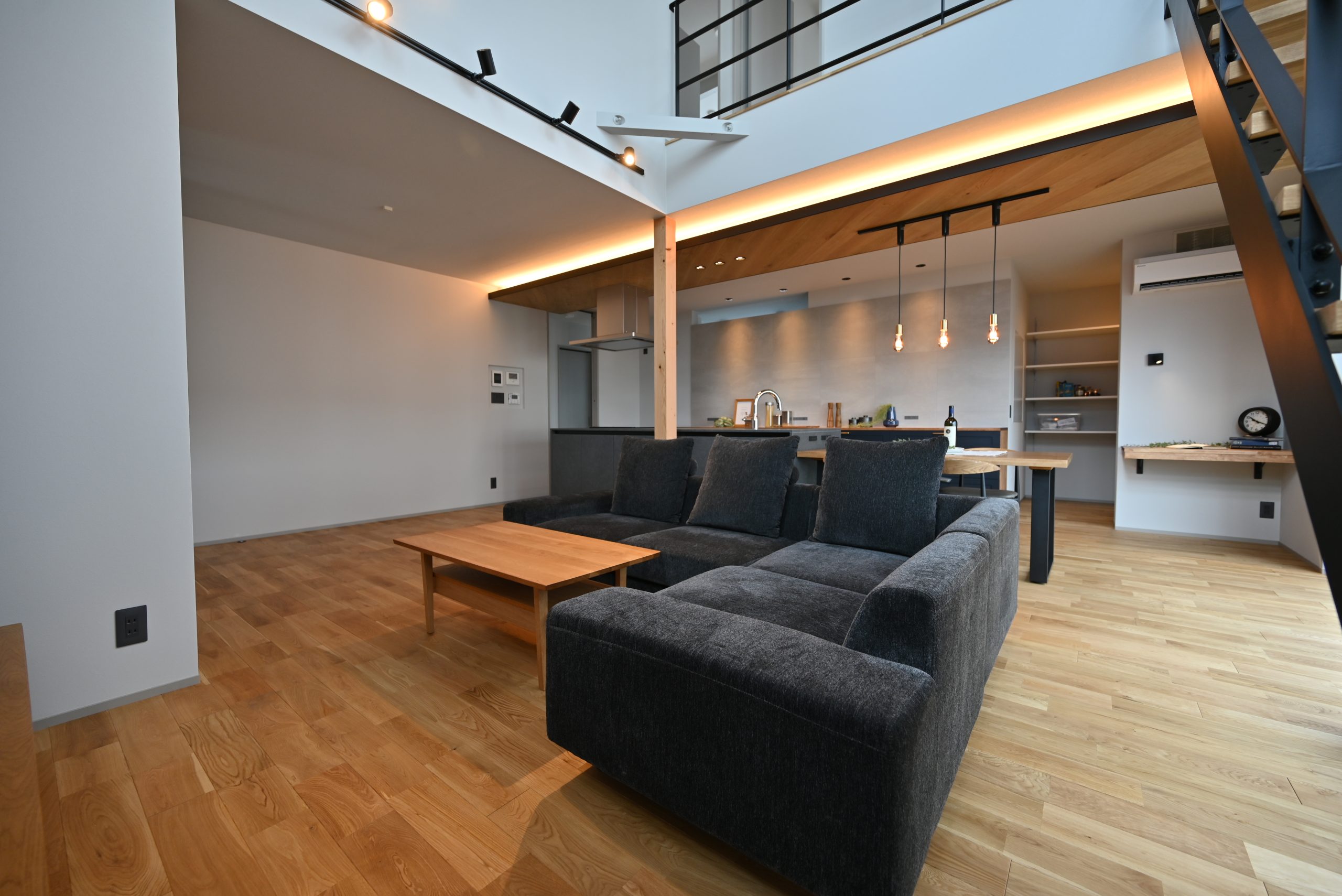 吹き抜けから光が注ぎ、グレーと木の温もりが調和する開放的なリビング。