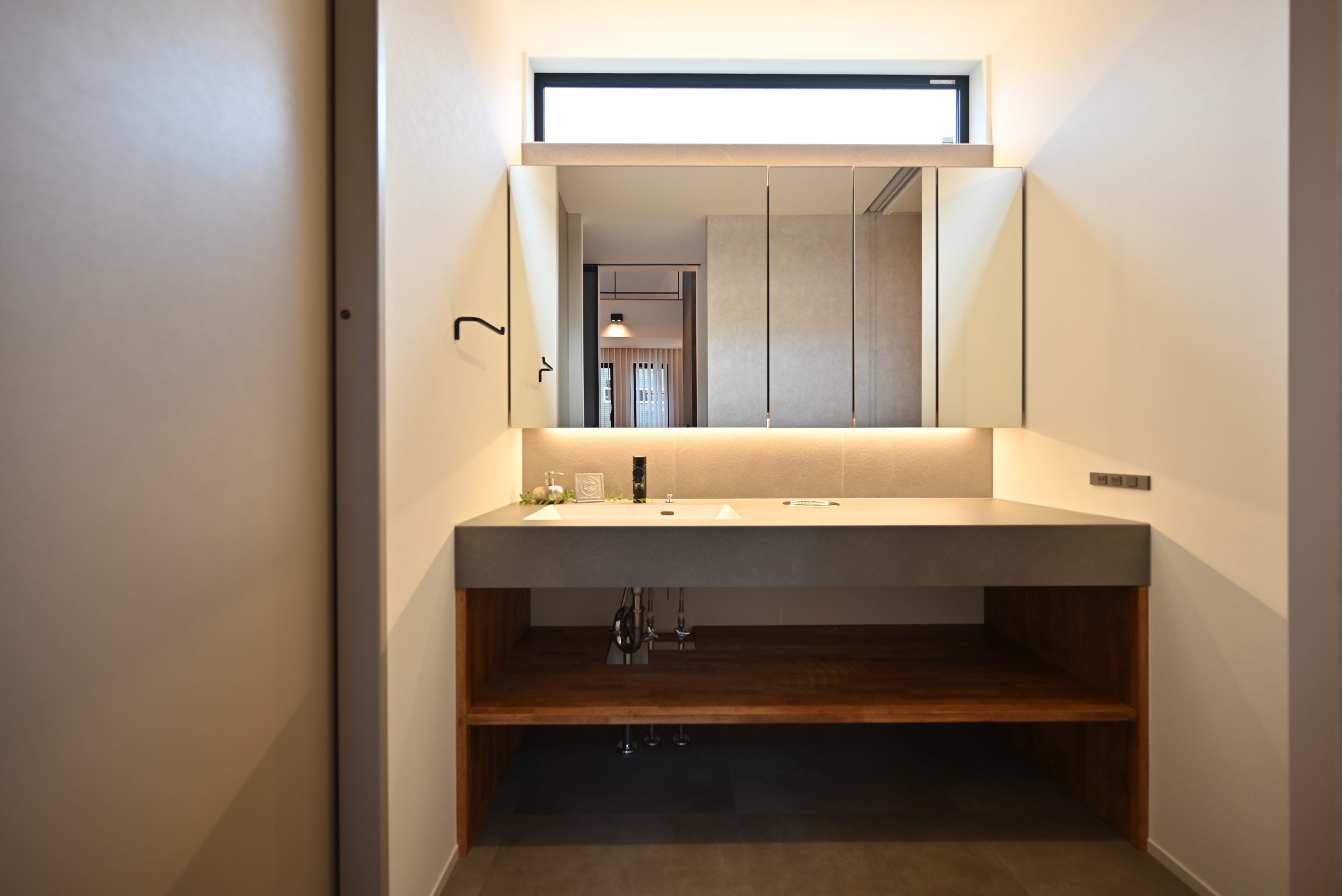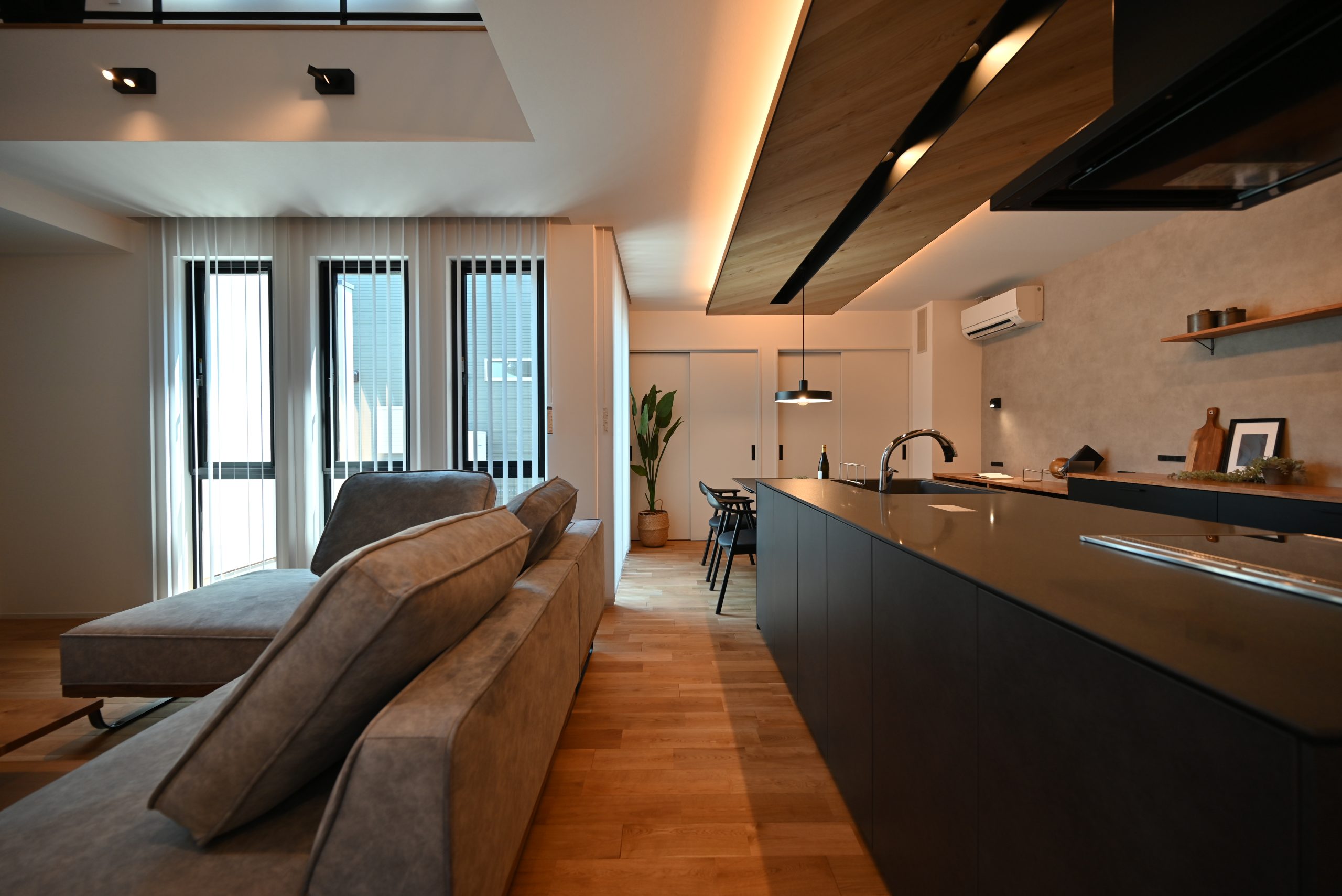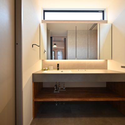 グレイッシュなトーンで統一された空間は、素材と照明のバランスにこだわり、シンプルながらも奥行きのある表情に。