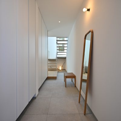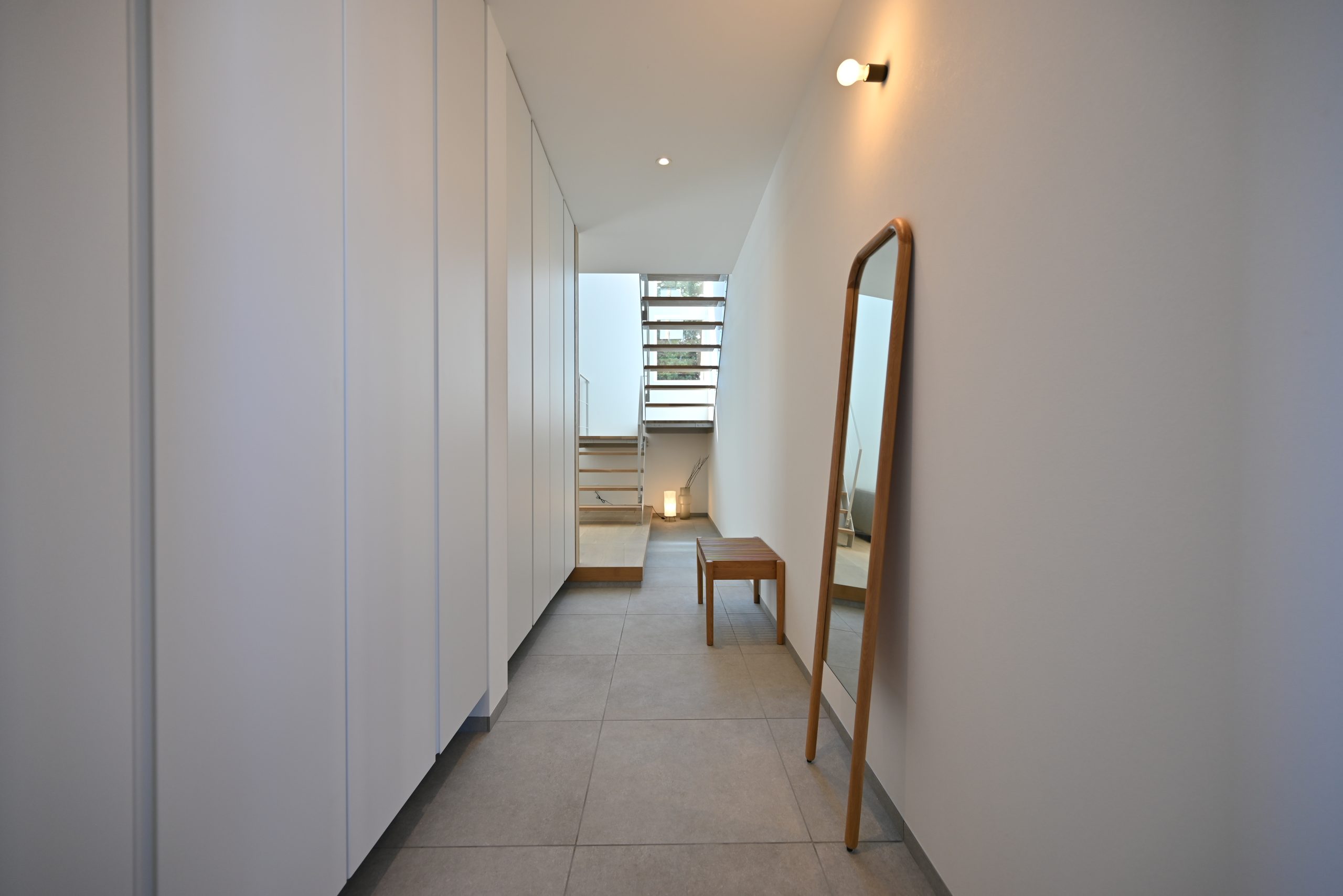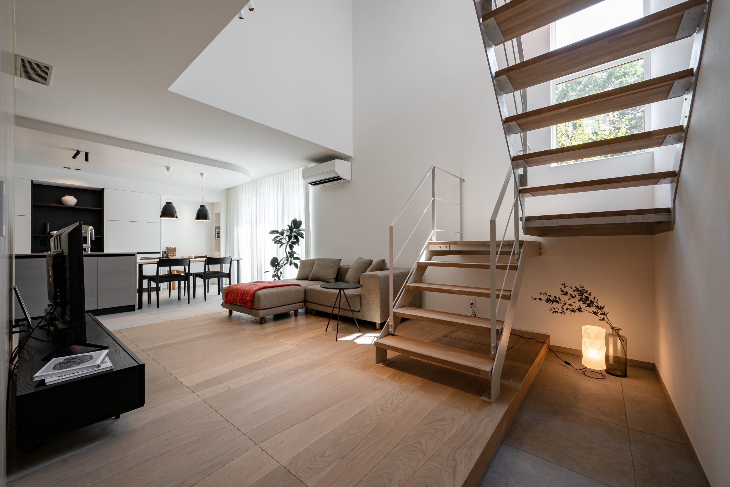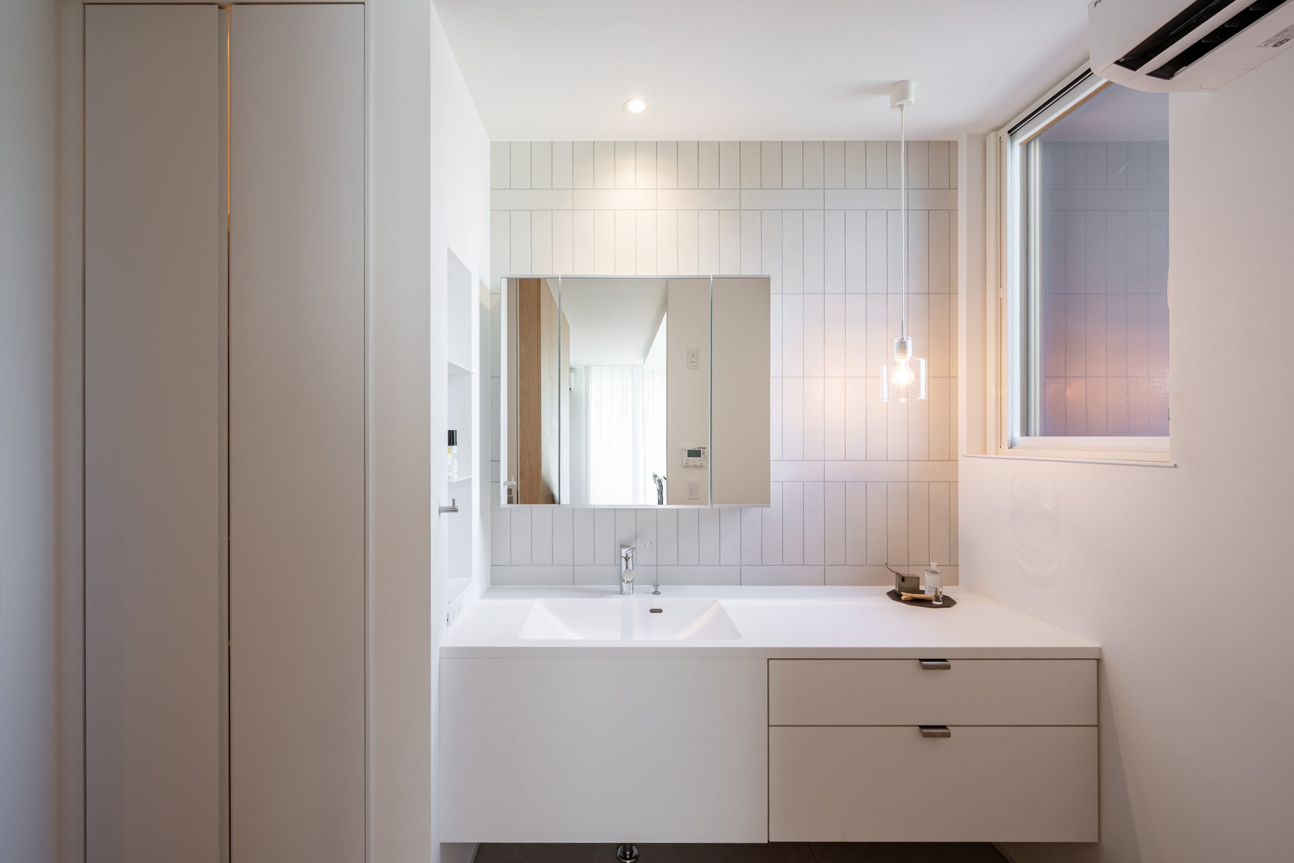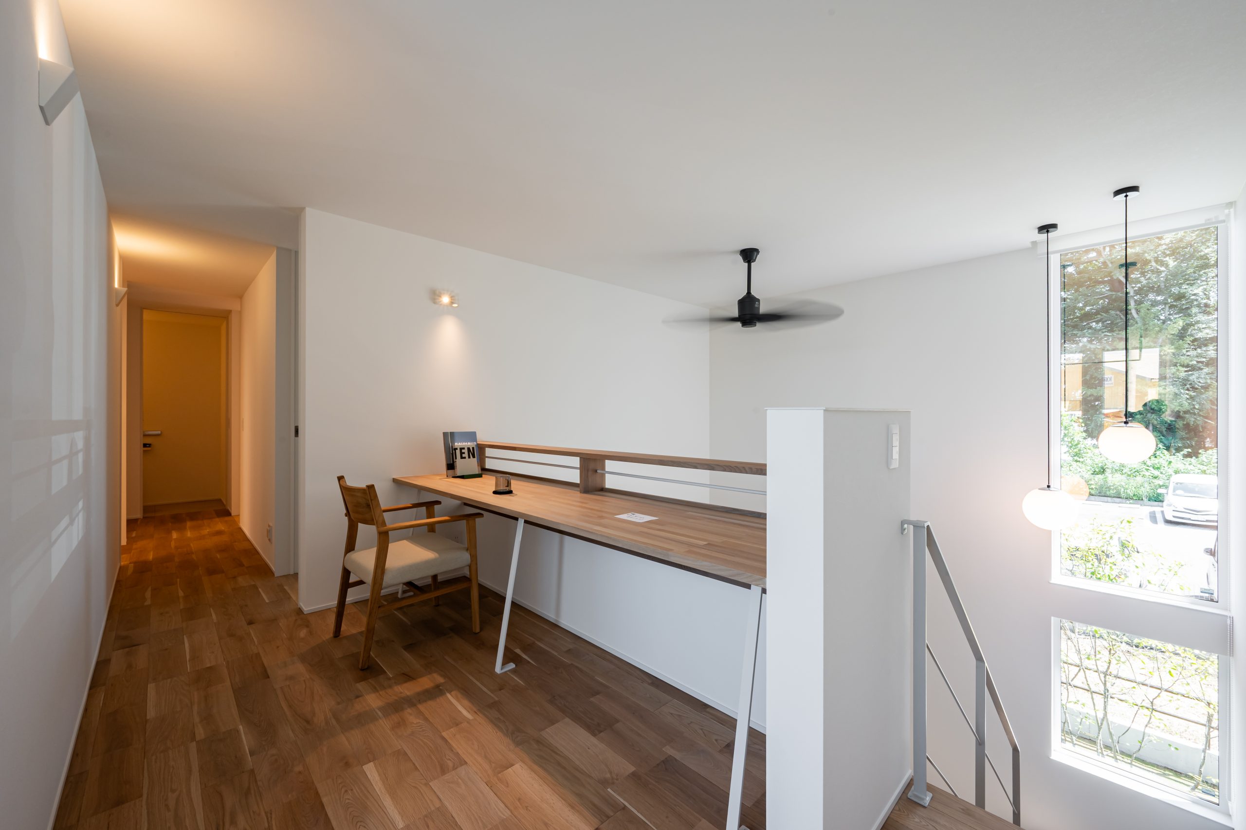 吹き抜けから差し込むやわらかな光が空間に奥行きを生み、落ち着いたトーンで統一された内装が、まるでホテルのような上質さを演出しています。