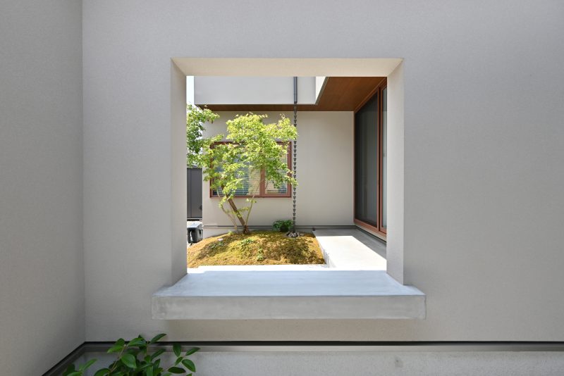 四角に空いた外壁の一部にはアクセントのベンチスペース。その先には、プライバシーを守りながらも閉塞感を感じさせない中庭空間が広がります。
