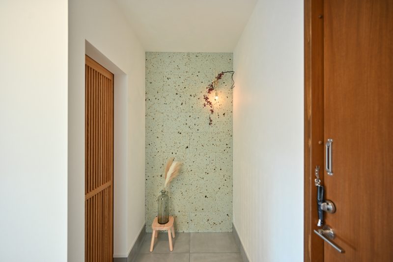 玄関右側は、控えめでいて個性的な大谷石をアクセント壁として。格子扉の向こうには広々としたシューズクローゼットを備え、使い勝手の良い開放的な玄関スペースに。