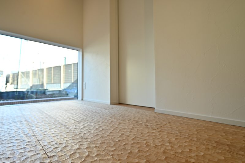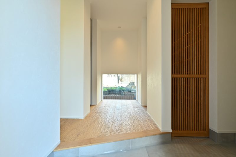 玄関扉を開けると出迎えてくれる借景。木材の表面に凹凸をつけるなぐり加工を施した床は、光に動きを与えてくれます。