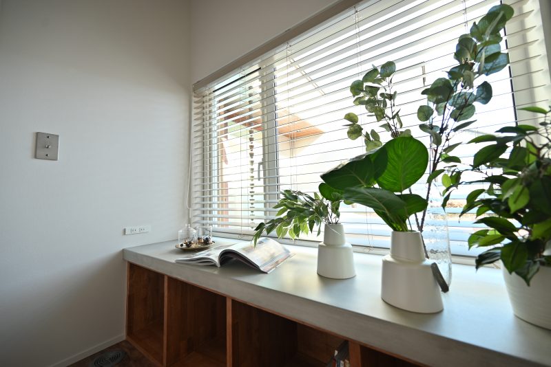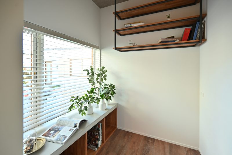 陽の光がたっぷりと入り、植物も生き生きと育つ書斎スペース。窓からは庭が見え、子供たちの遊ぶ姿を眺めながら作業ができます。