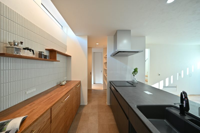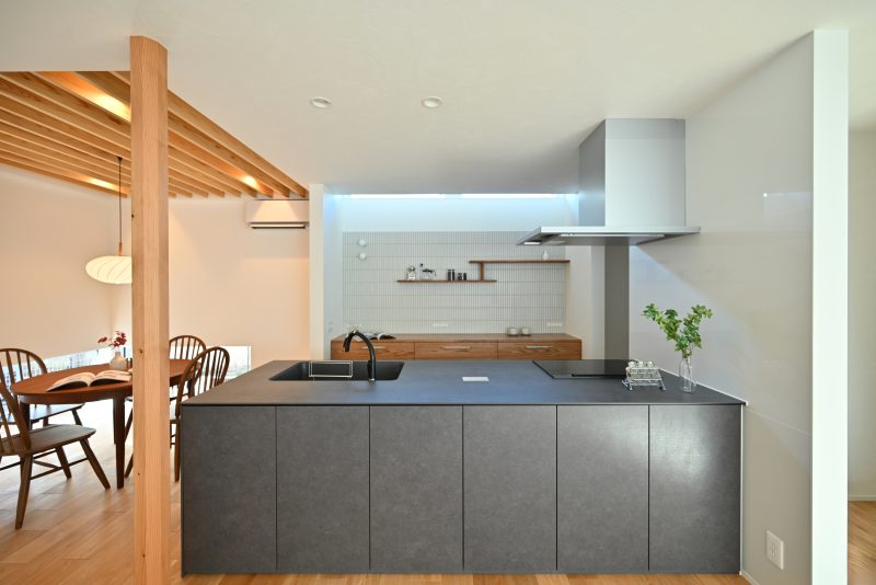 和モダンになり過ぎない色合いや材を選定。北欧家具が映えるようなシンプルなコーディネートに仕上げたキッチン