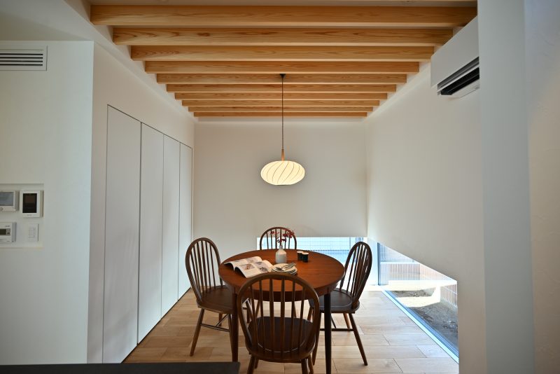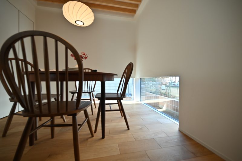 四季を感じながら毎日の食事を楽しめる、地窓のあるダイニング。地窓を設置することで空間を広く見せる効果も。