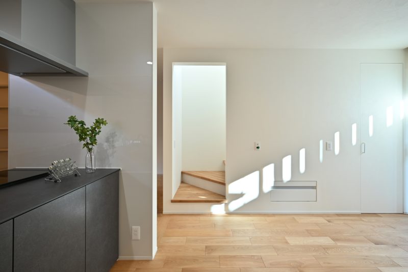 強い光が苦手な奥様のため、直射日光が入らない窓配置で明るさを確保したリビング。小さい真四角の吹抜けからは光が柔らかく差し込みます。