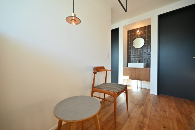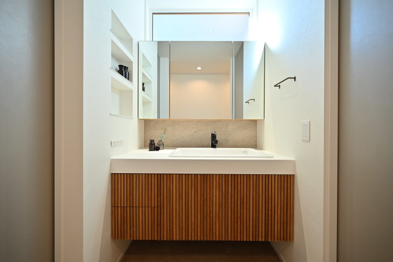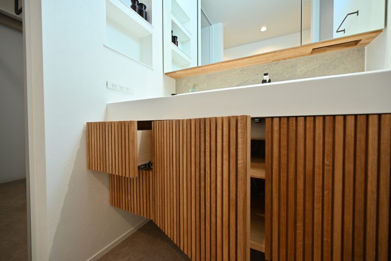木の色合いが美しい洗面台。しっかりと収納も確保し、美しさを保つ工夫がされています。