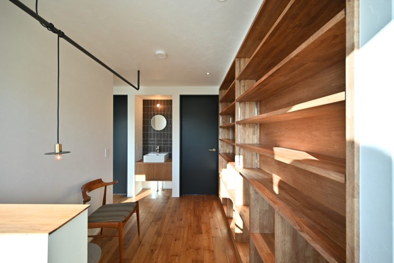 2Fへ上がると、そこにはたくさんの本が収納できる造作本棚が。読書好きのオーナー様が一息ついて、ゆったりと読書を楽しめる癒しの空間。