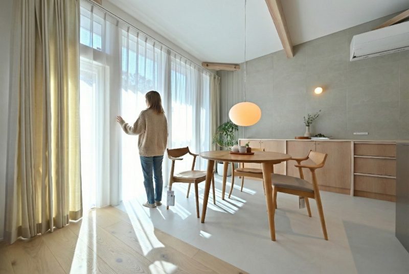 木のぬくもりは残しつつホワイト塗装で柔らかな印象のリビング。窓際には可愛らしく照明が配置されています。
