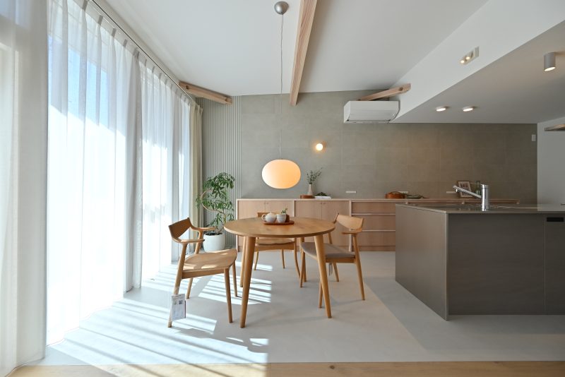 光のたっぷり入るダインニング。リビングと床材を切り替えることで柔らかく空間を仕切ります。