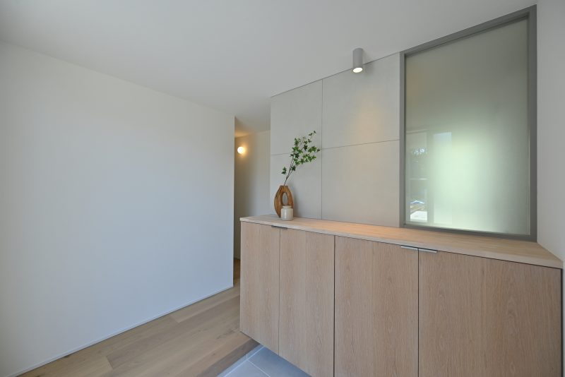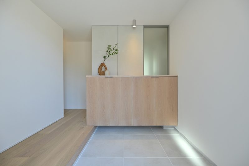 大判タイルで高級感のある玄関。シンプルながら洗練されたデザインになっています。