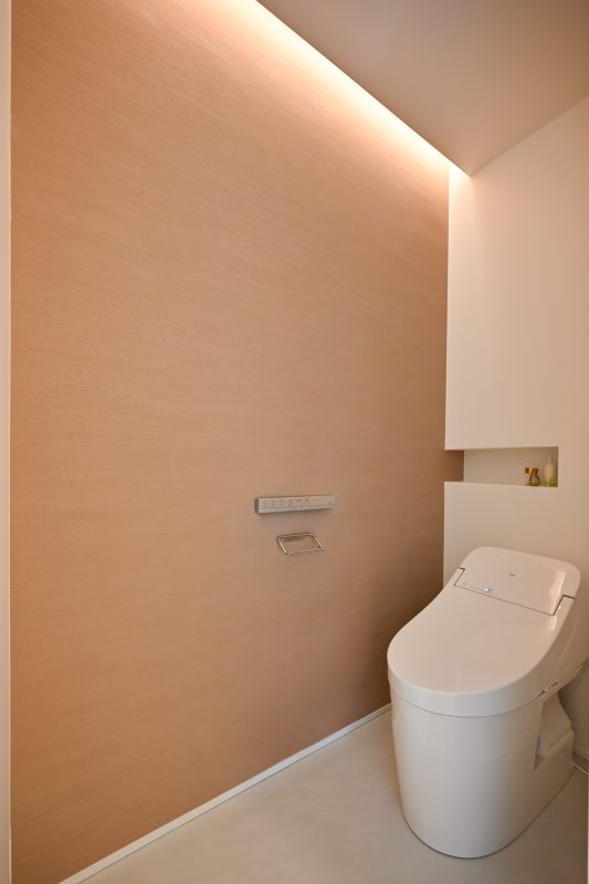 間接照明を採用し落ち着く空間に。ペーパーホルダーには棚を付けず広く使える設計にしました。