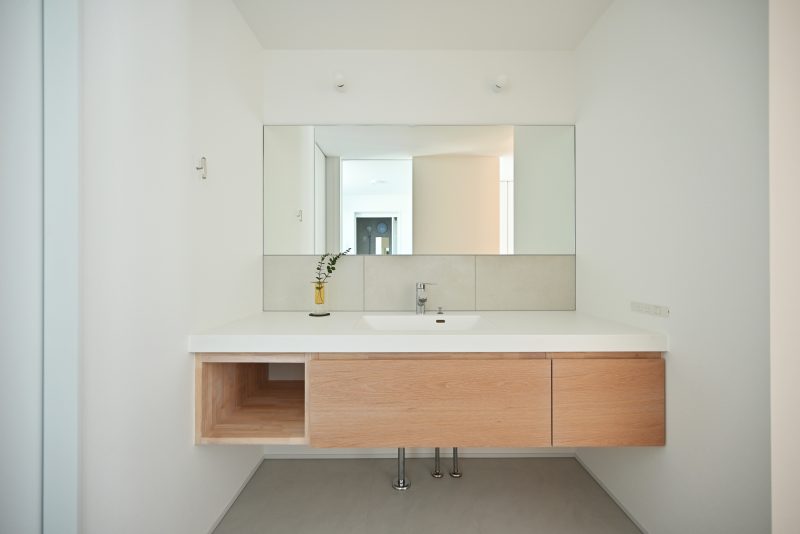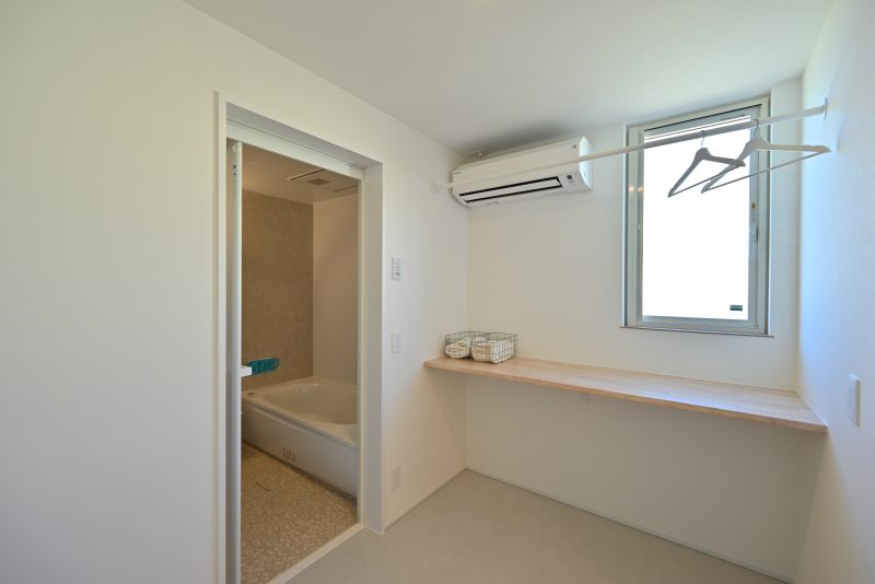 広々とした脱衣スペースにはカウンターを設け、洗濯物の片づけや着替え置きなど多用途に使用できます。