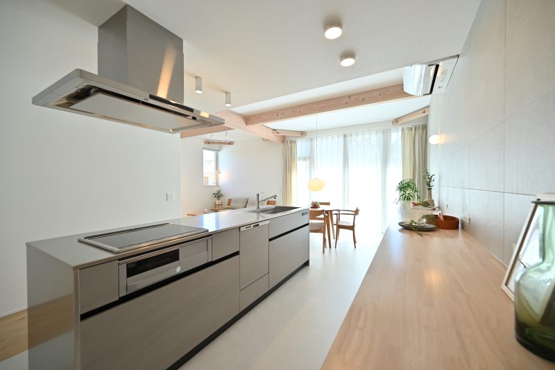 大容量のパントリーと壁面収納でいつでも綺麗なキッチンを叶えました。高さを抑えることで開放感ある空間に。