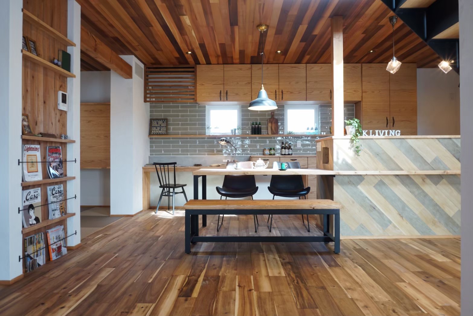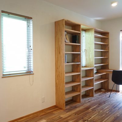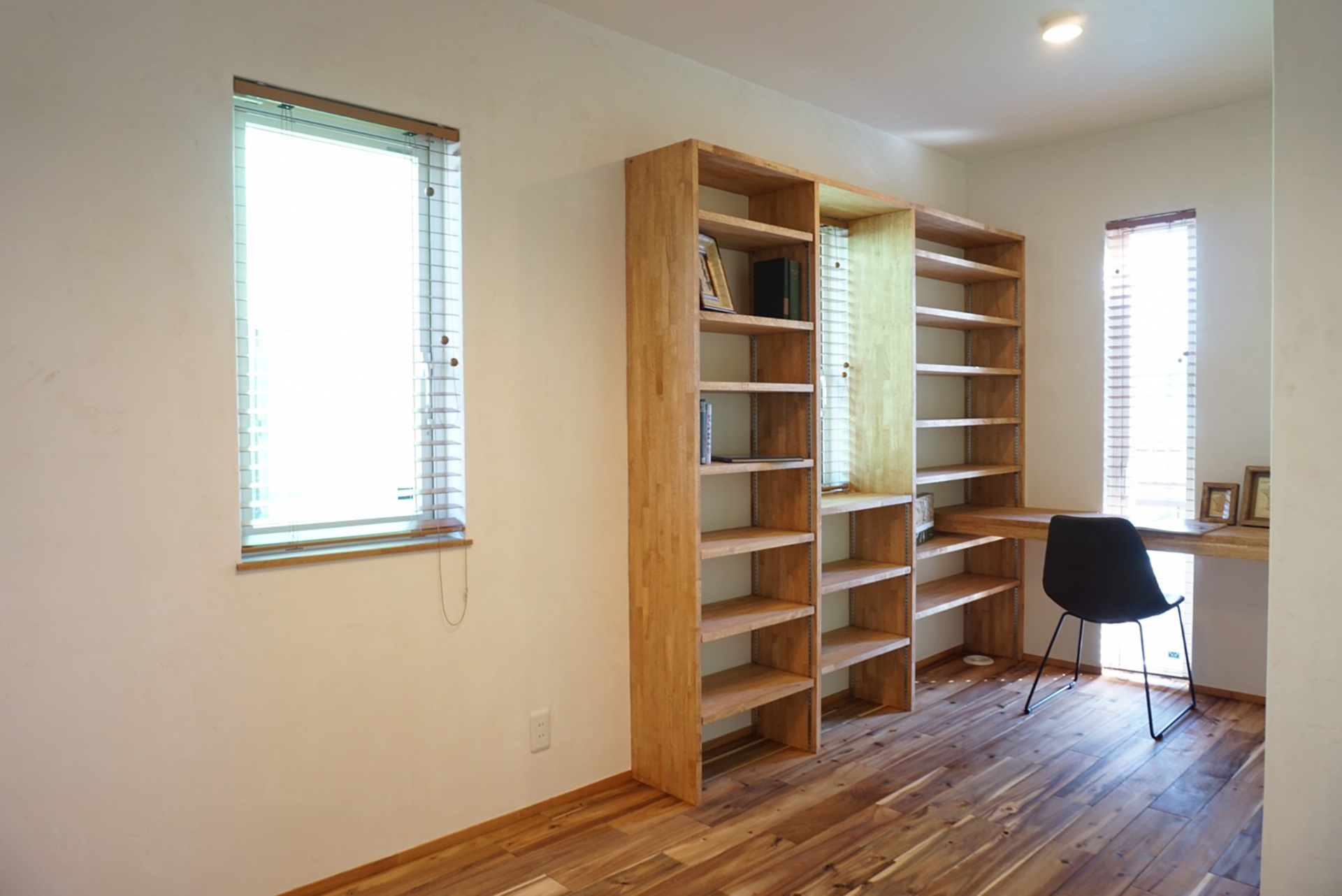 ほかにもリビングからキッチンまで続く板張りやたくさんの本が置ける造作棚がある読書ルーム。