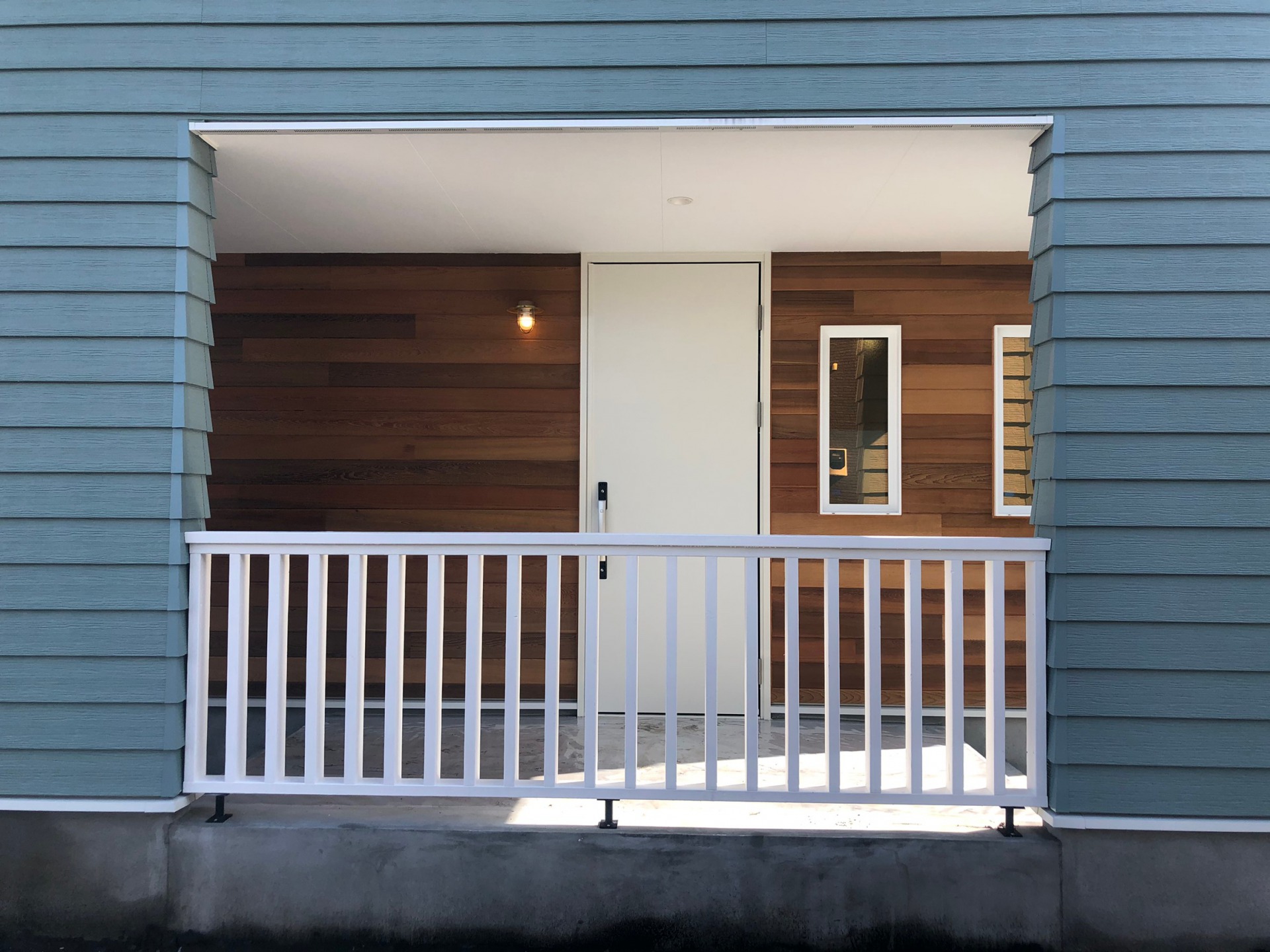 ベースはホワイトの塗り壁に、アクセントのオーシャングリーンがとっても素敵なお家になっています。