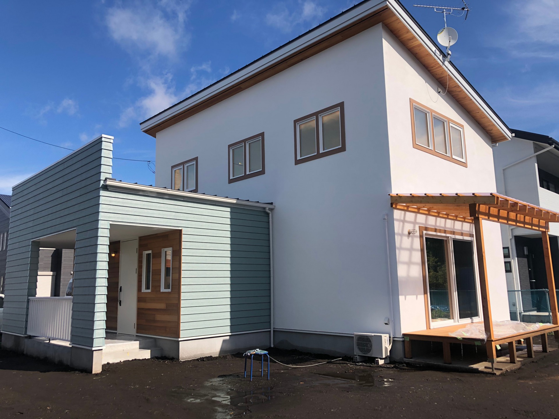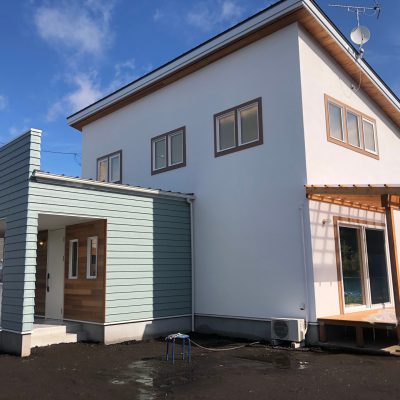 オーシャングリーンの素敵な外観のお家が完成しました。