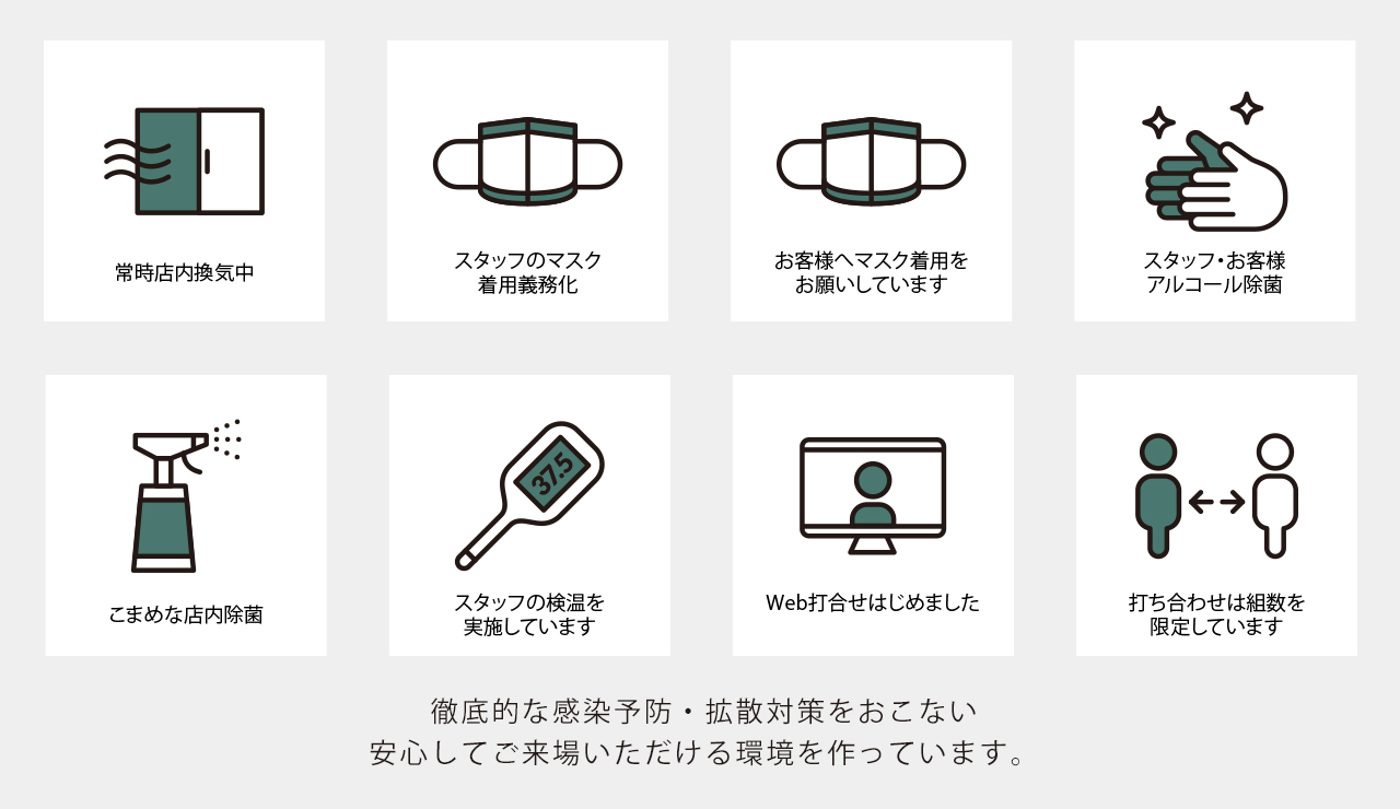 (2)徹底して対策を行っておりますが、心配な方はお家にいながら気軽にできるWEBでの打合せを推奨しています。