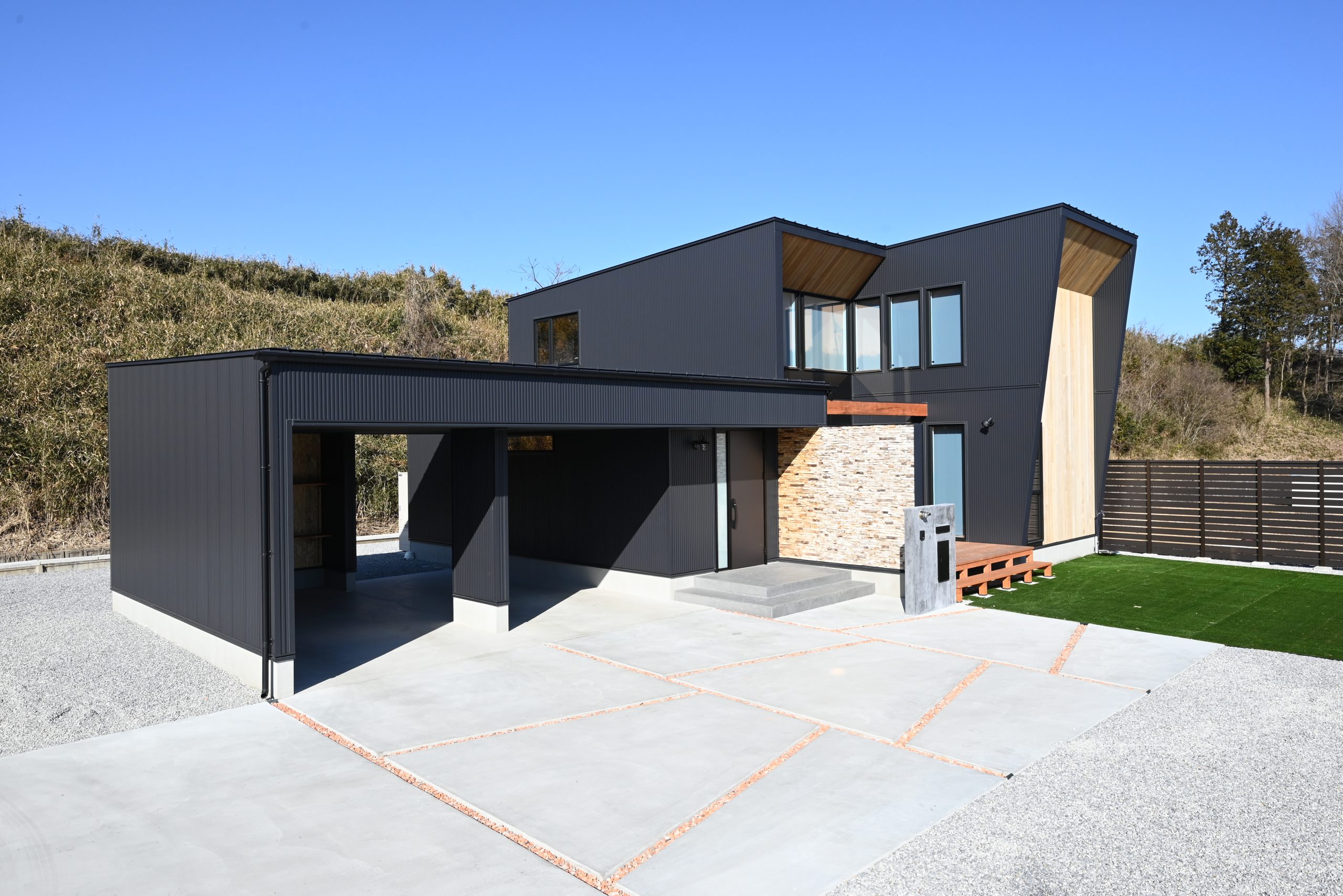 金属サイディングと異素材の組み合わせが絶妙でカッコいい。