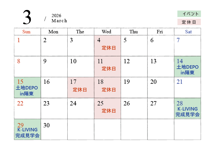 2026年3月K-LIVINGイベント&定休日のお知らせです。