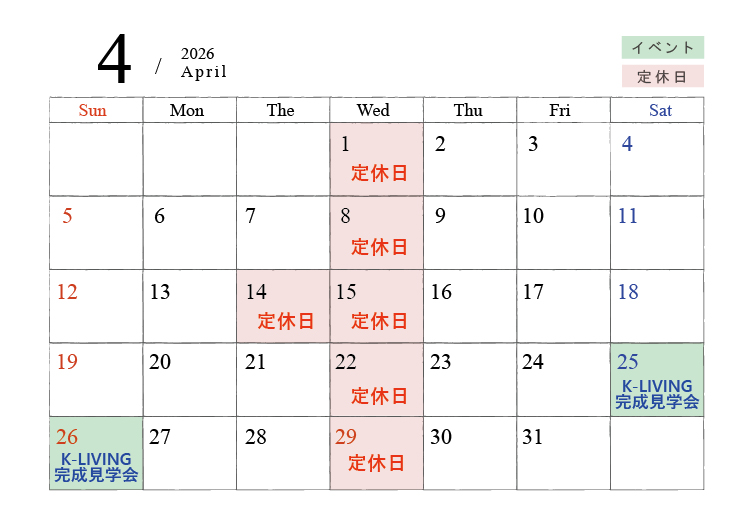 2026年4月K-LIVINGイベント&定休日のお知らせです。