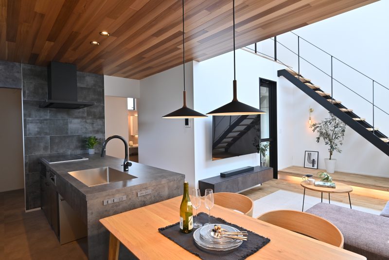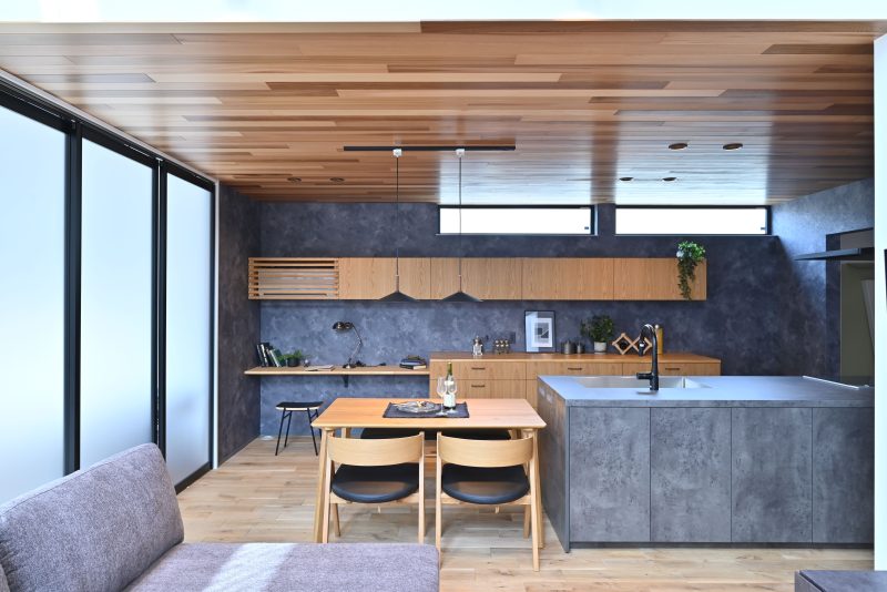 キッチンから外部まで続く板張りの天井が圧巻の、シンプルでカッコいい内装です。