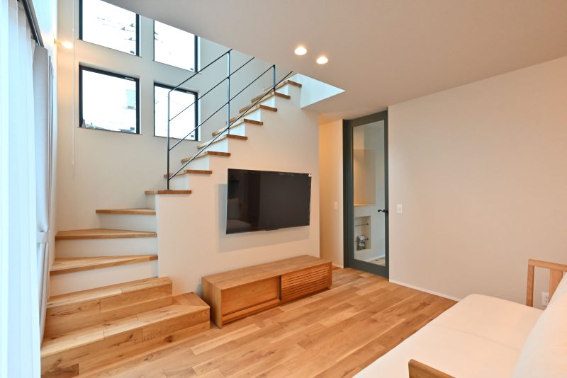 外部からの視線を遮り光だけを効果的に取り入れられる連窓風の窓から差し込む光は、リビングと木階段を暖かく照らします。