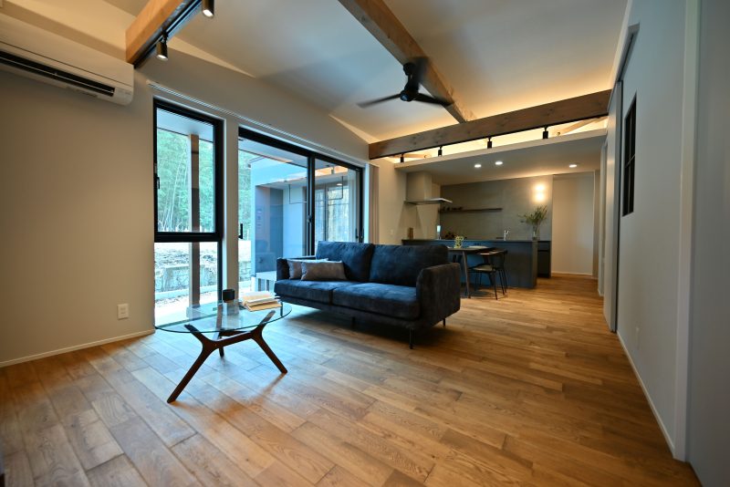 温かみのある無垢材のフローリングと、力強い化粧梁が空間に奥行きを与えます。