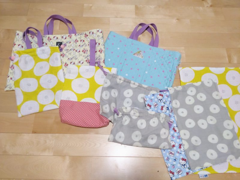 手提げバッグや上履き入れなど、ミシンでとことこ作りました。