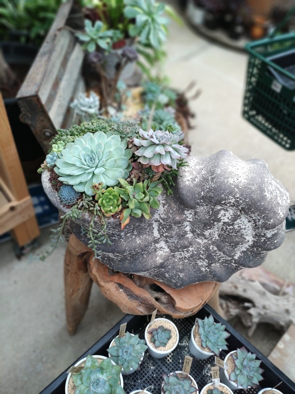 色々な種類の多肉を集めた寄せ植えもたくさんあって、かわいい。。。