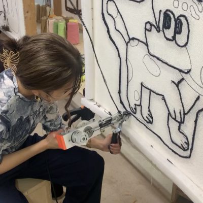 タフティングガンに糸を通したら早速打ち込みます。