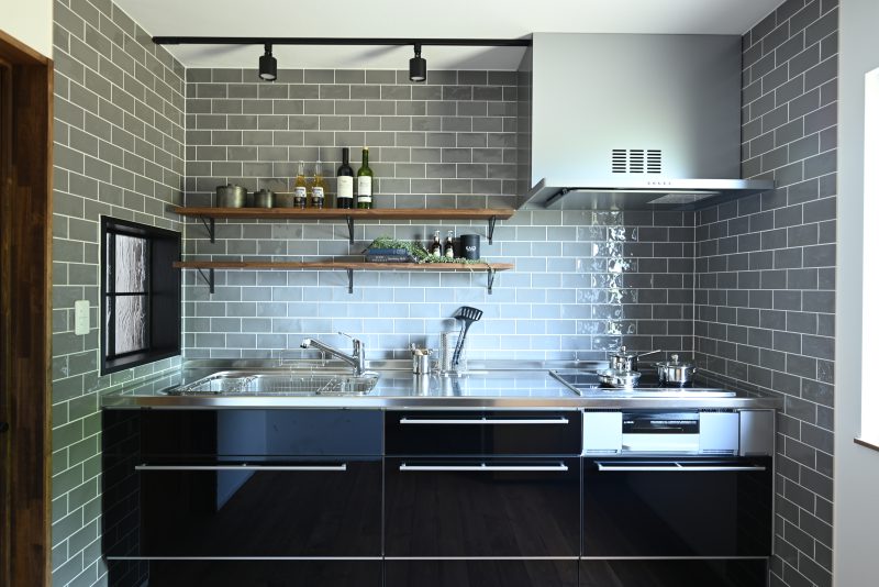 大胆に一面タイルを張ったキッチンはゆるやかにリビングと区別されたっぷりの食品庫も備えられています。ランドリースペースはウッドデッキからも出入りできるようになっていて、水廻りが一直線に繋がって洗濯の動線もばっちりです。コンパクトながら、生活動線が考えられたシンプルスタイルの平屋のお家になりました。