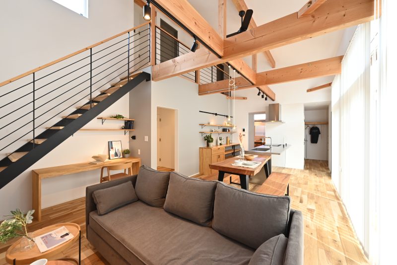 大きな吹抜けと梁が真っ先に目に入る、1.5階建てのナチュラルなお家です。